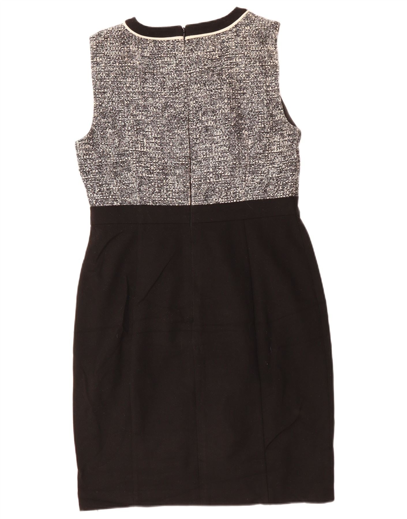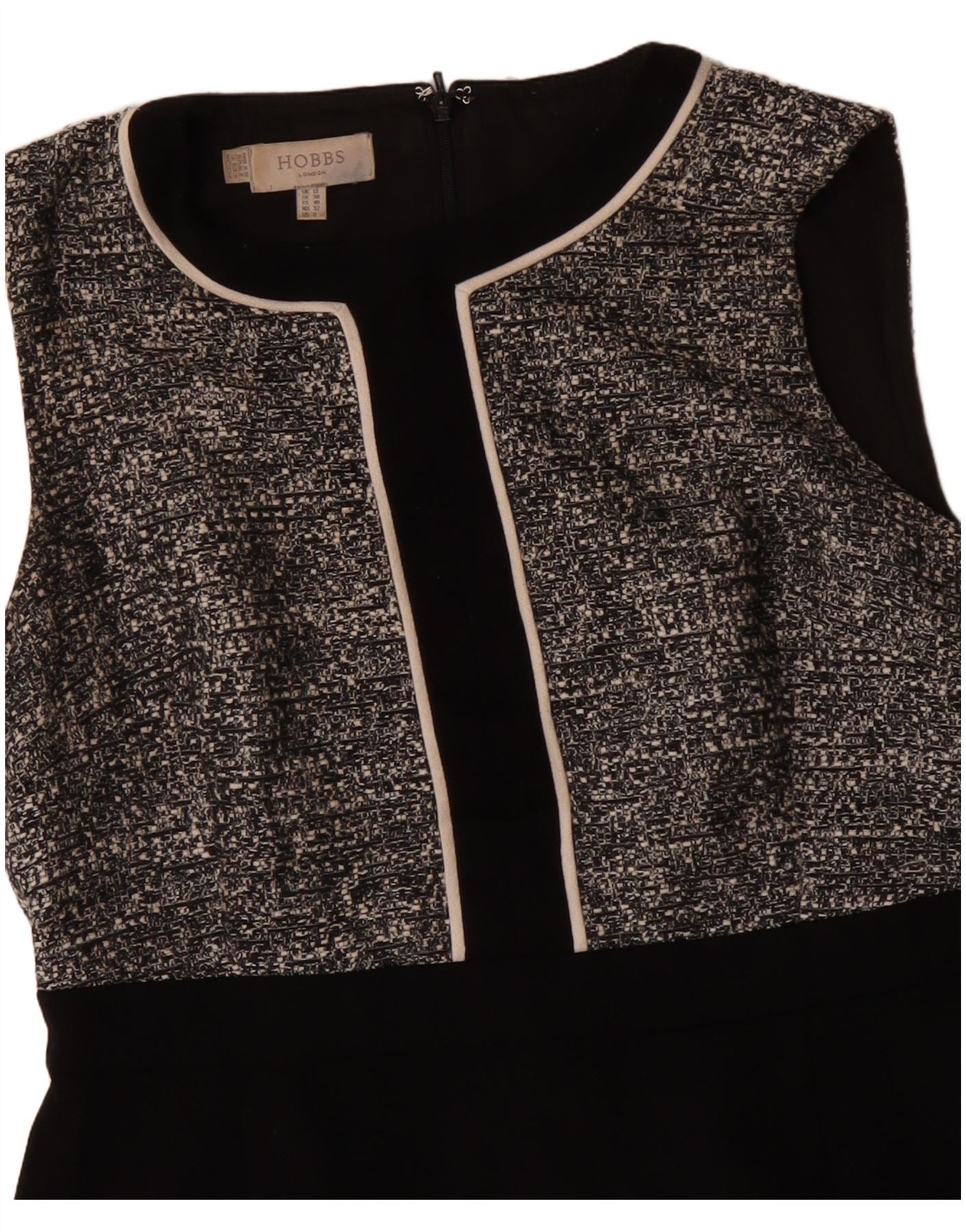 - AI Description: This Hobbs womens sheath dress features a sophisticated black and white flecked tweed bodice. The lower skirt is crafted from smooth black fabric. It has a classic round neckline and a sleeveless cut. A contrasting trim outlines the neckline and central panel. The regular fit offers a flattering silhouette. The flecked pattern on the bodice adds textural interest. A rear zip closure ensures a neat finish.