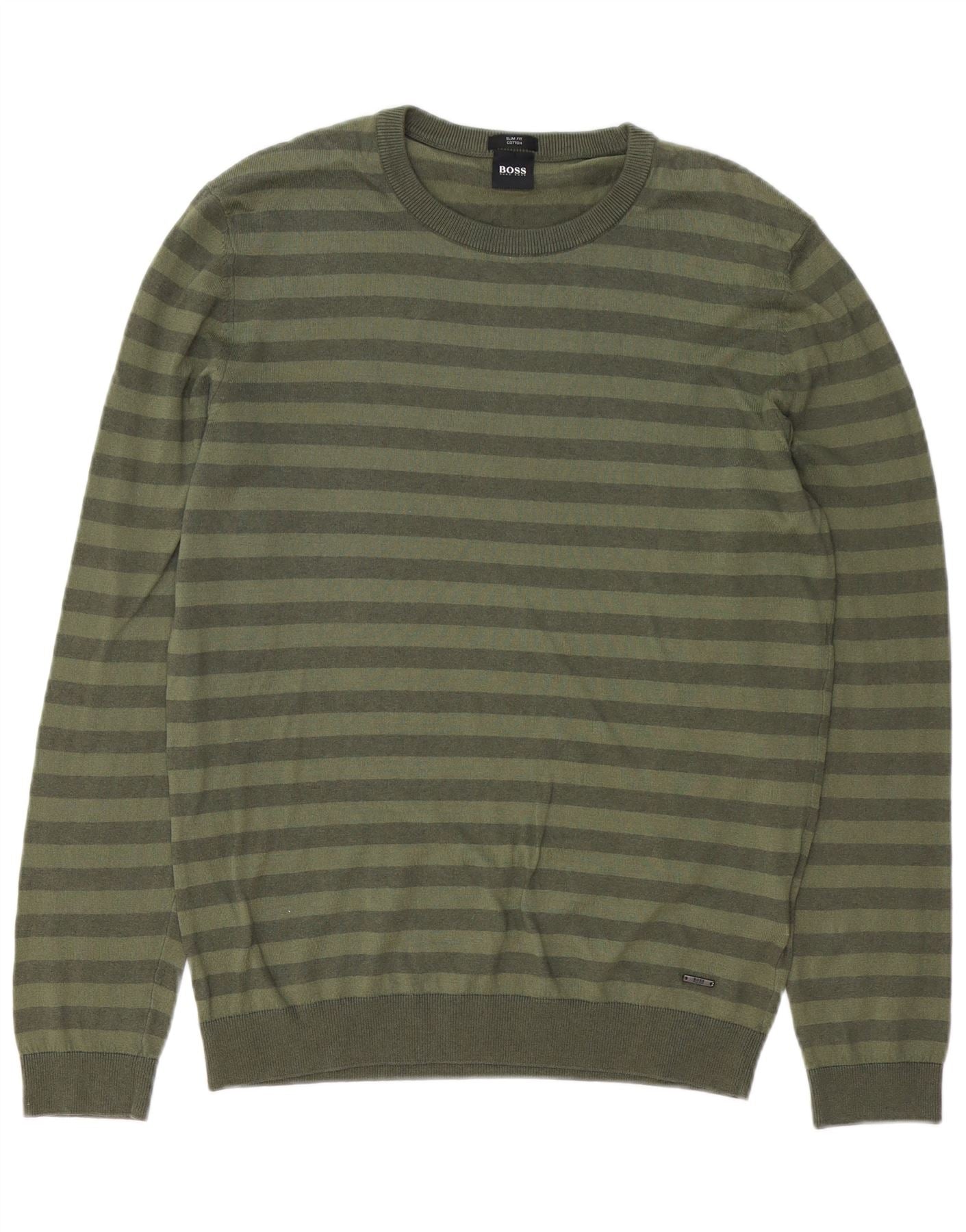 HUGO BOSS Mens Slim Fit Crew Neck Jumper Sweater Large Green Striped