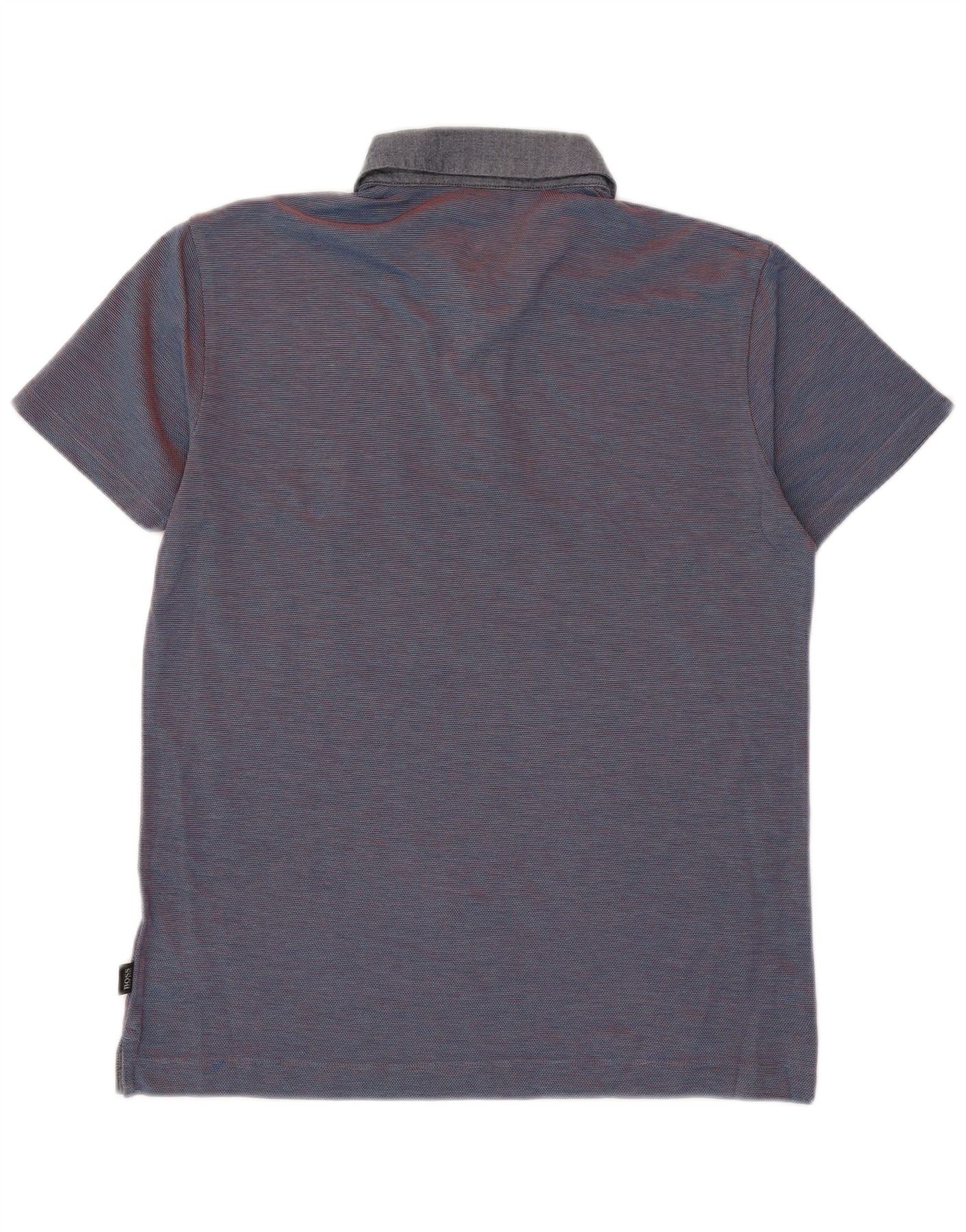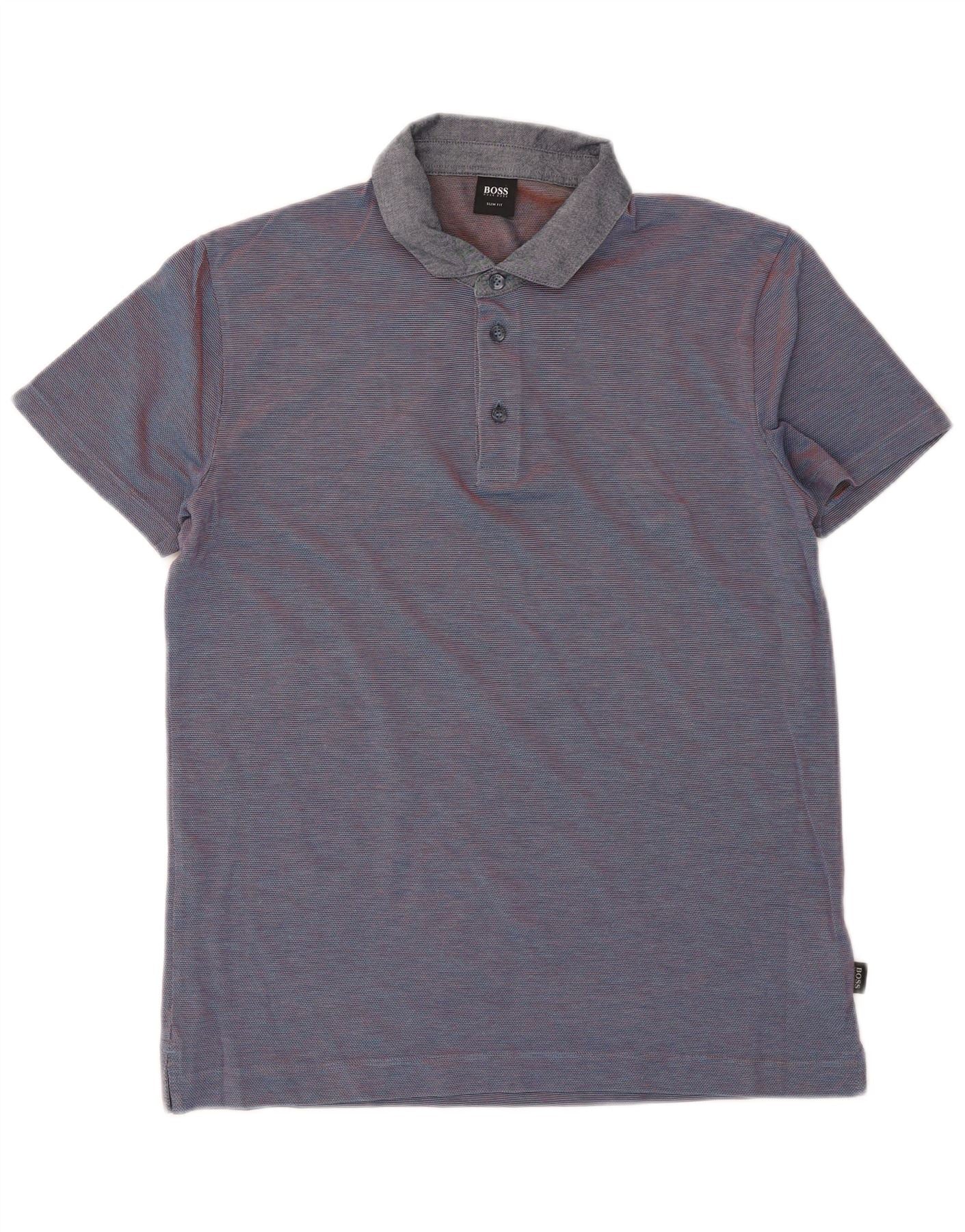 - AI Description: This Hugo Boss men's Polo Shirt is crafted from a lightweight, stretchy knit fabric. It features a textured blue body with subtle red horizontal stripes. The contrasting grey collared neckline and short sleeves offer a refined look. A three-button placket adds classic detail. Its slim fit ensures a modern, comfortable silhouette, perfect for smart casual wear.