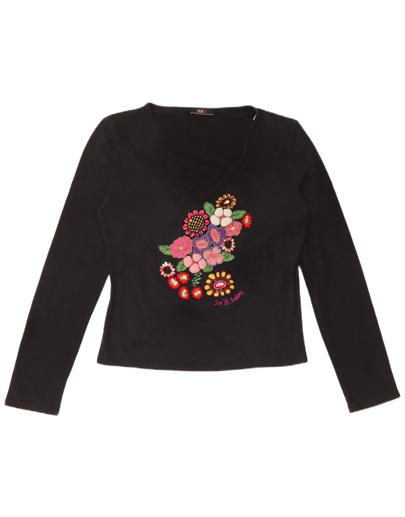 ICEBERG Womens Crop Graphic Top Long Sleeve IT 46 Large Black Floral