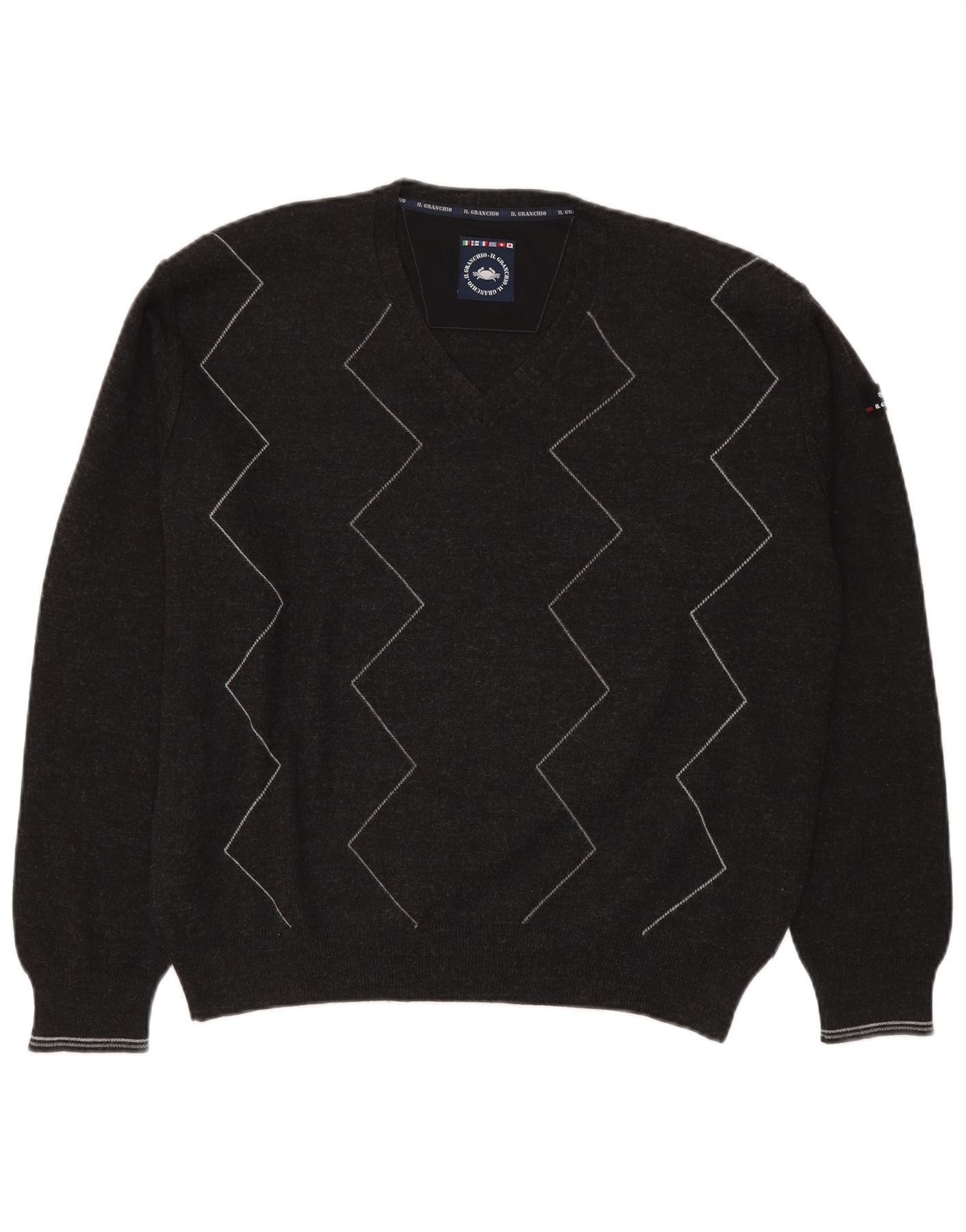 Il Granchio Mens V-Neck Jumper Sweater Large Grey Geometric New Wool