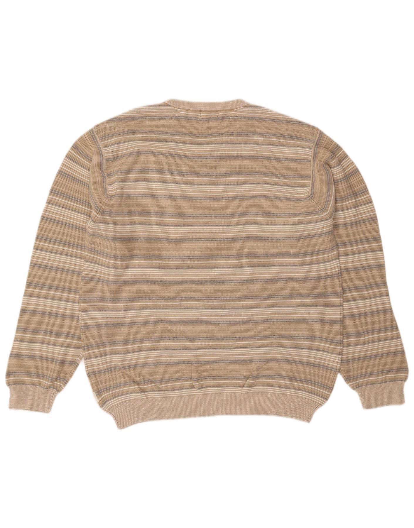 IZOD Mens Crew Neck Jumper Sweater Medium Beige Striped Cotton