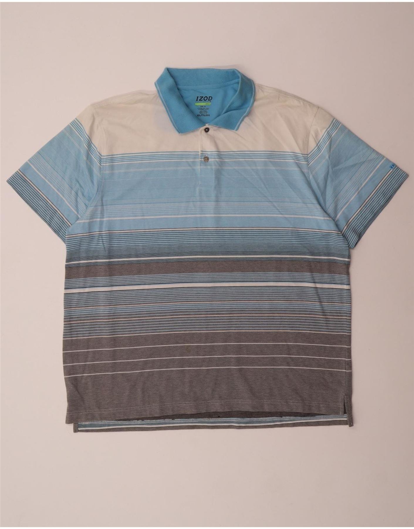 - AI Description: This Izod mens Polo Shirt is crafted from a breathable cotton polyester blend fabric. It features a distinctive striped pattern in blue, grey, and white. The collared neckline and short sleeves offer a classic silhouette. A button-up placket adds a refined touch. Designed for a regular golf fit, it provides comfort and stretch for active wear.