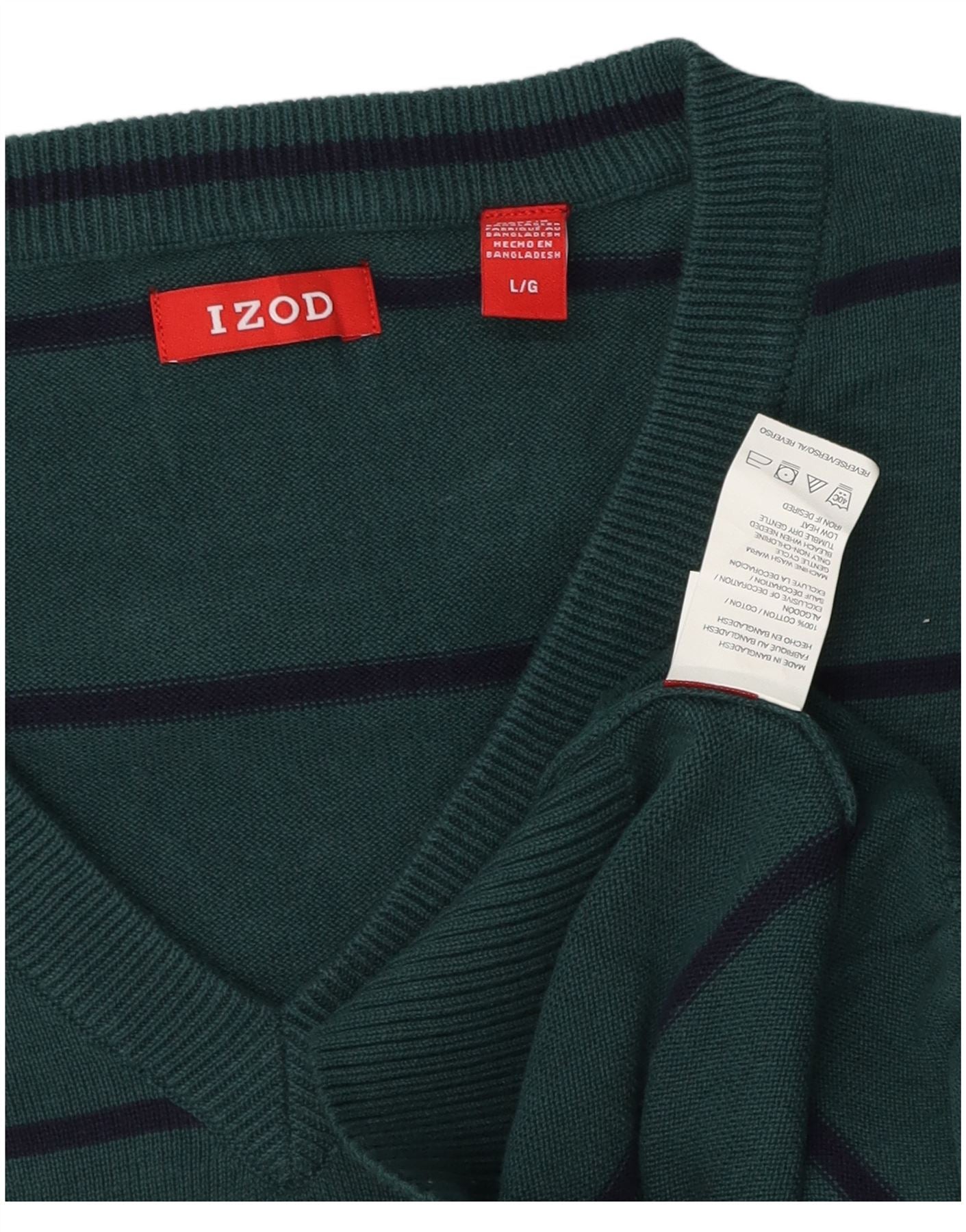 IZOD Mens V-Neck Jumper Sweater Large Green Striped Cotton