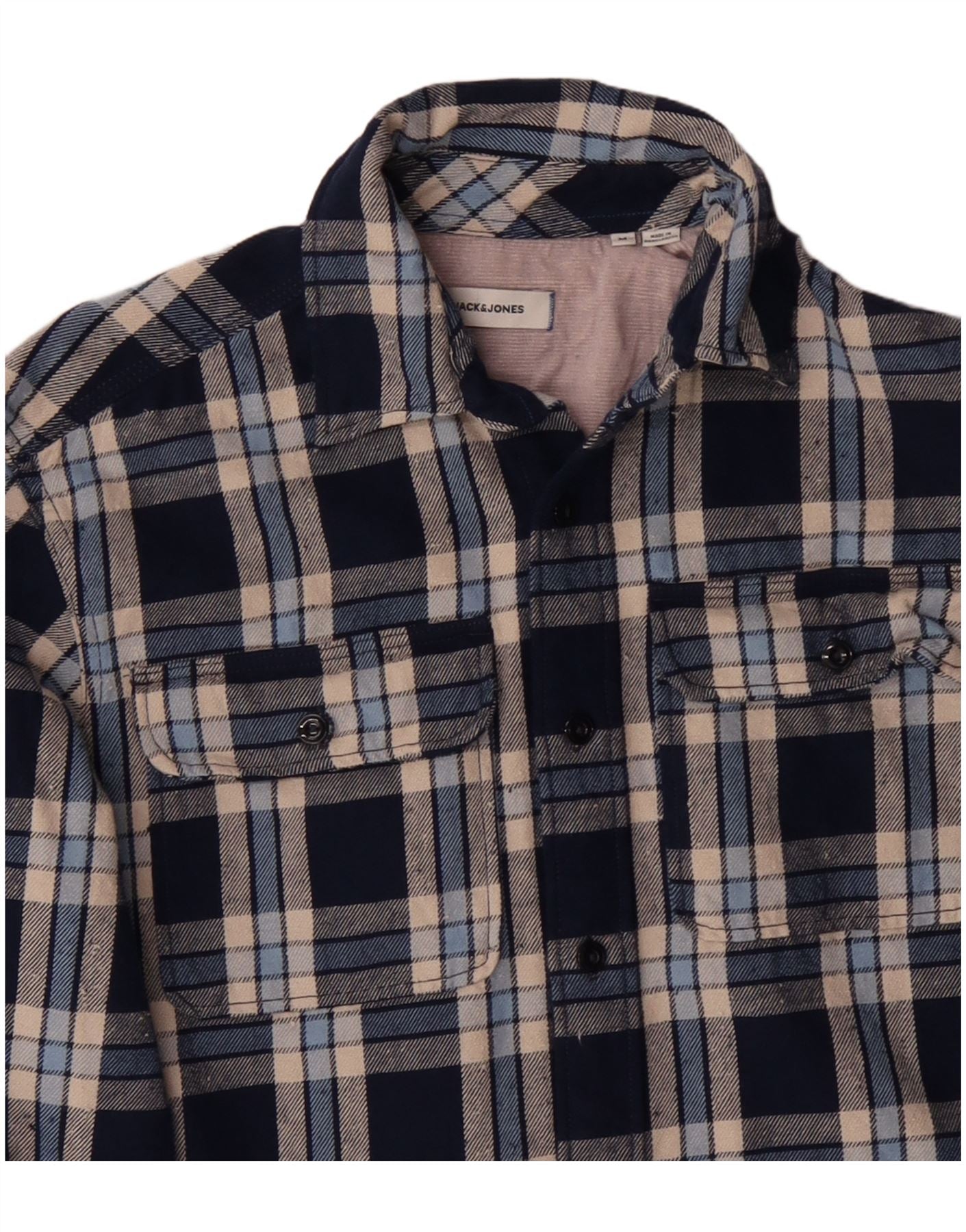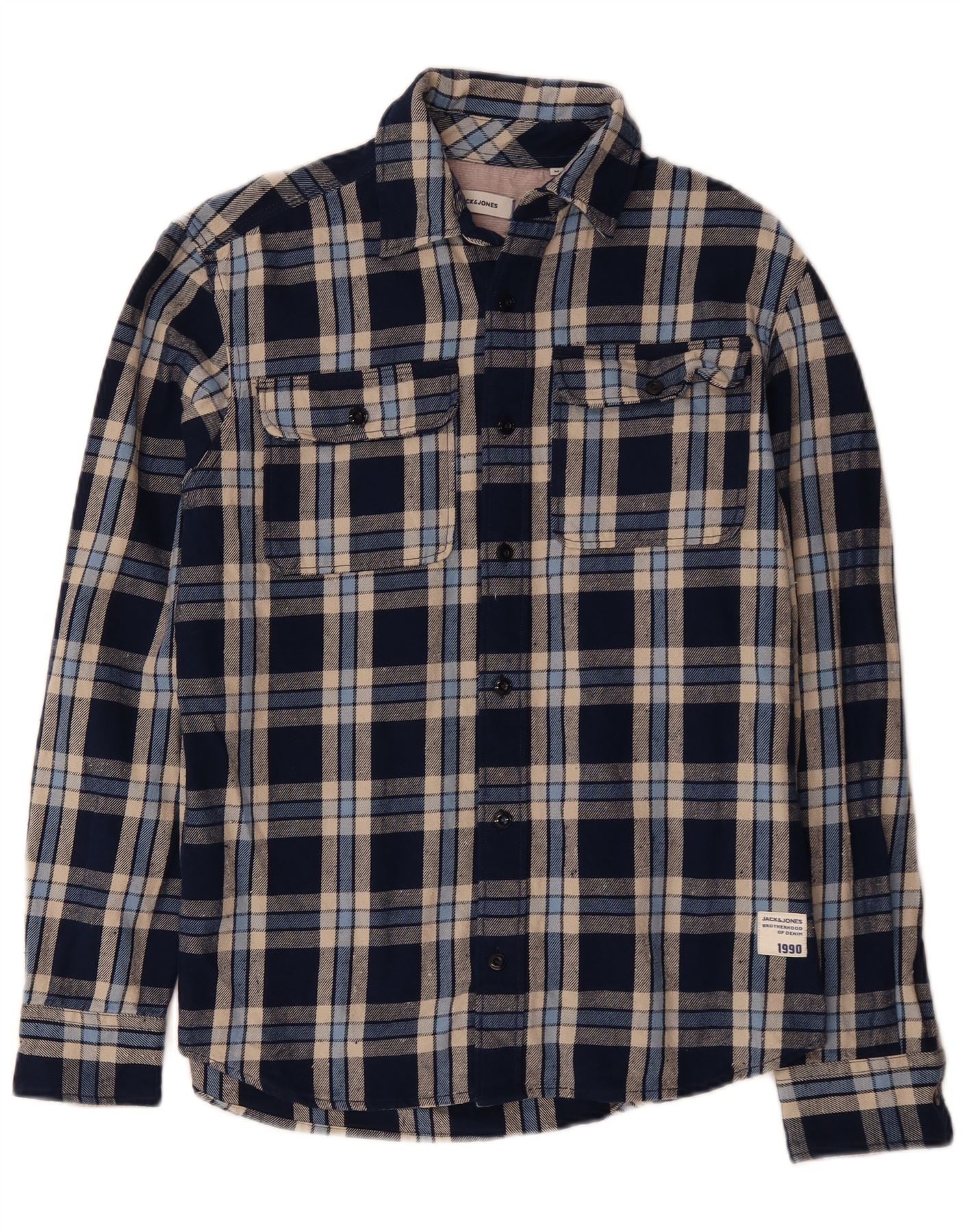 JACK & JONES Mens Flannel Shirt Medium Navy Blue Check Cotton