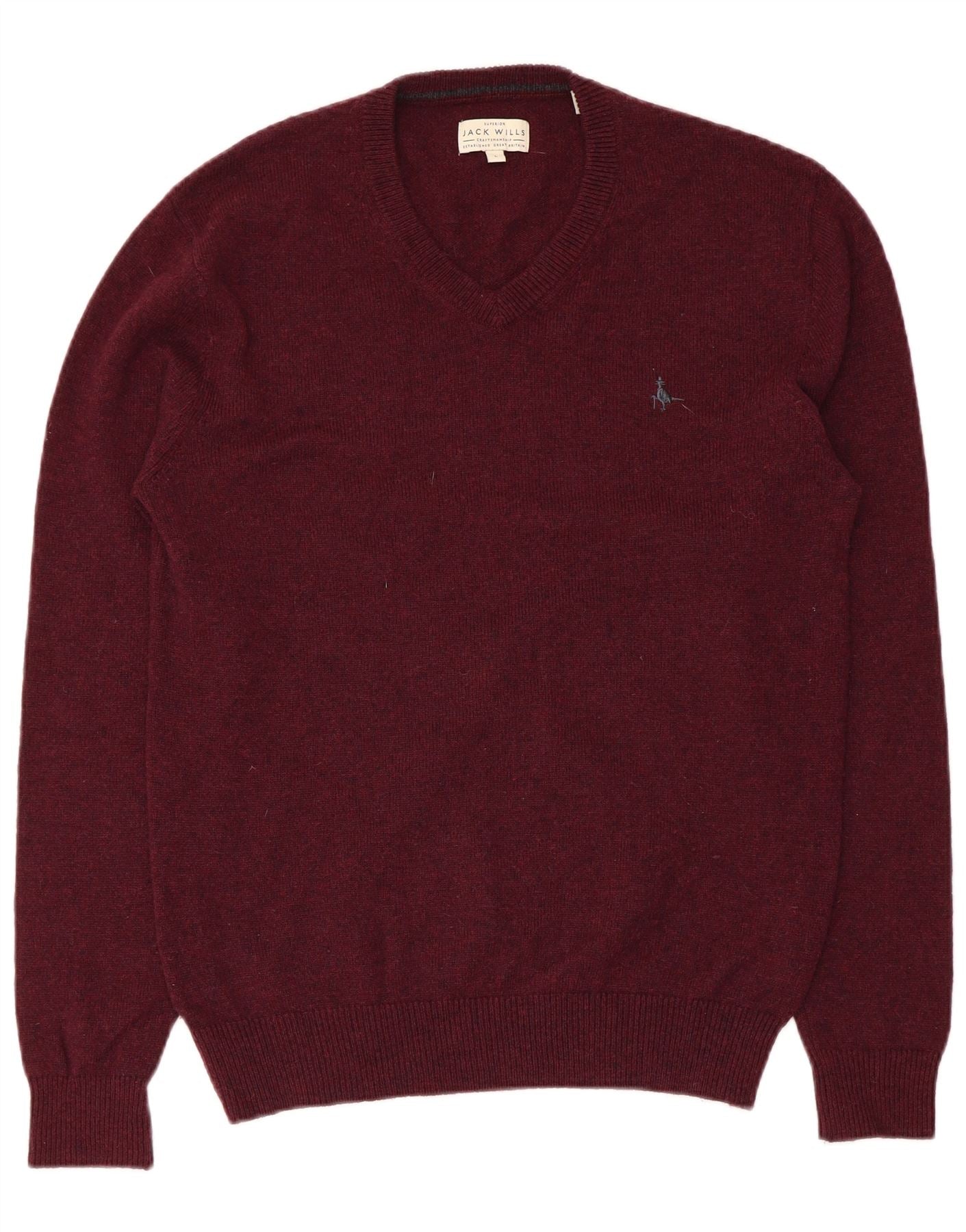 JACK WILLS Mens V-Neck Jumper Sweater Large Maroon Merino Wool