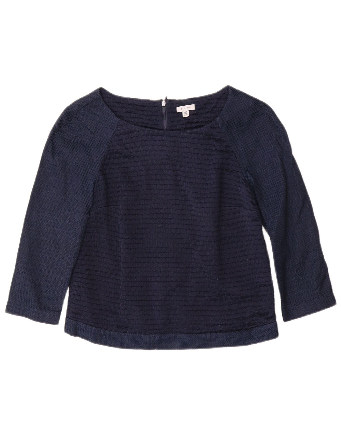 - AI Description: This Jigsaw womens 3/4 sleeve top is crafted from a luxurious cotton and silk blend knit fabric. It offers a soft, comfortable feel with a subtle stretch. The round neck and regular fit provide a classic silhouette. Three quarter length sleeves add a refined touch. A sophisticated geometrical pattern enhances the navy blue hue. It features a discreet zip closure for a clean finish.