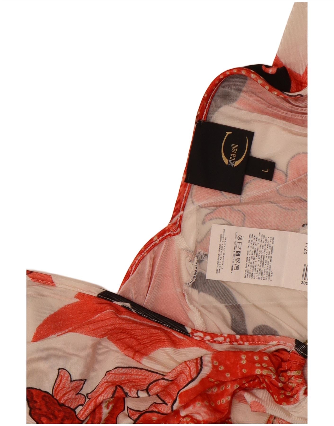 - AI Description: This Just Cavalli womens graphic T-shirt top is crafted from lightweight jersey fabric with a smooth, stretchy feel. It features a flattering V-neckline and a sleeveless design. The slim fit silhouette accentuates the figure. An eye-catching floral pattern in off-white, red, and black covers the garment. This pullover top offers a stylish and comfortable wear.