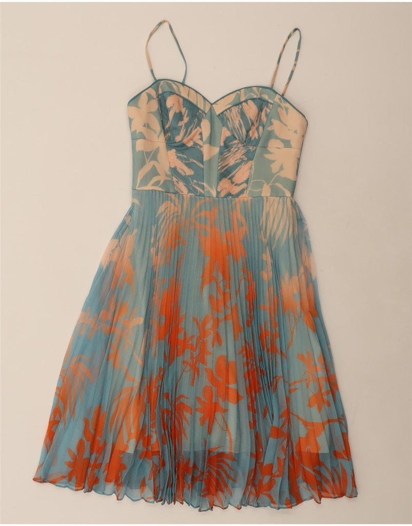 - AI Description: This Karen Millen womens sundress is crafted from 100 percent polyester woven fabric. It showcases a vibrant multicoloured tropical floral pattern. The sleeveless design features straps and a regular fit, ensuring comfort. This fully lined dress includes padded detailing. A neat zip closure secures the garment. Pleated accents throughout the design add elegant movement and refined structure.