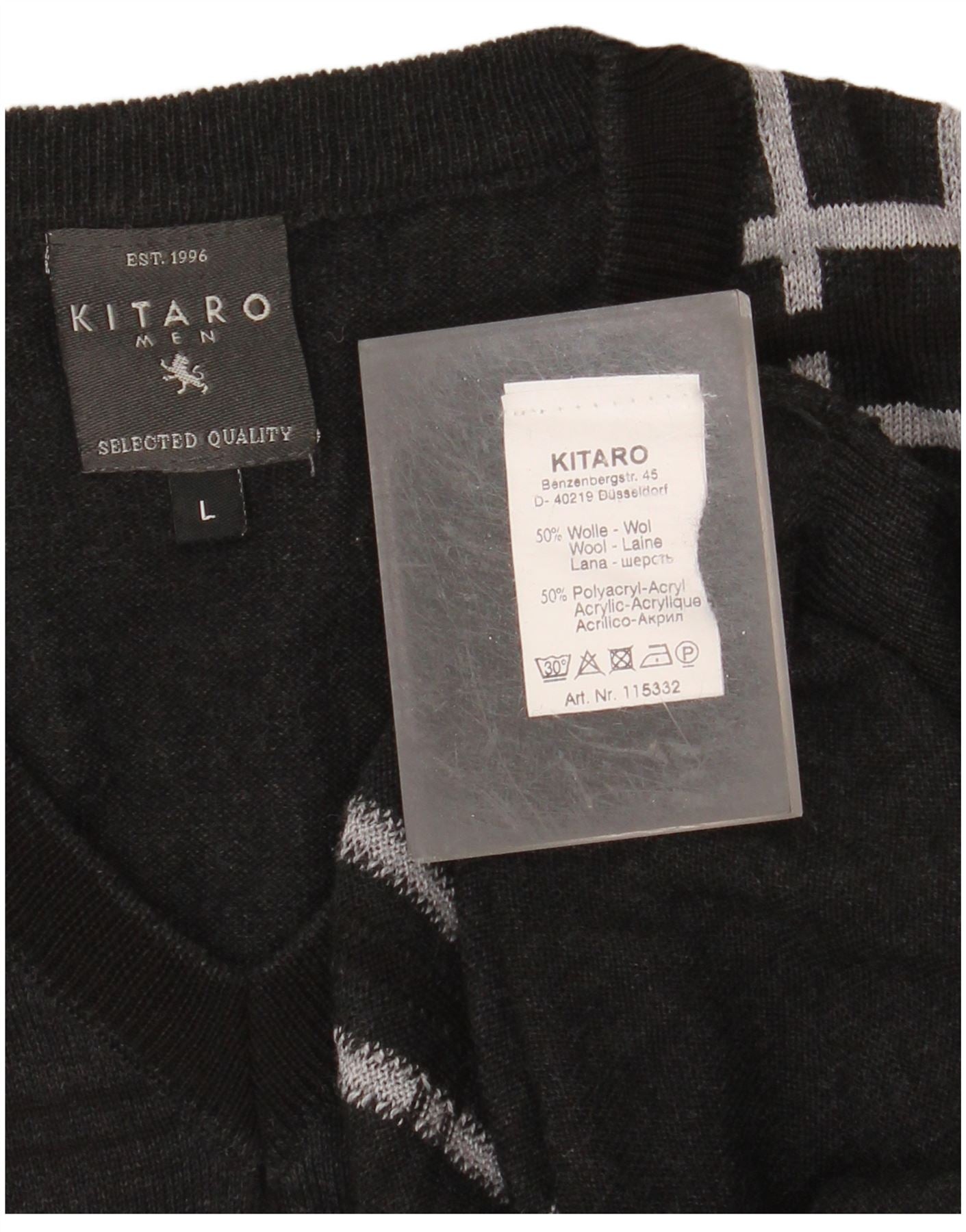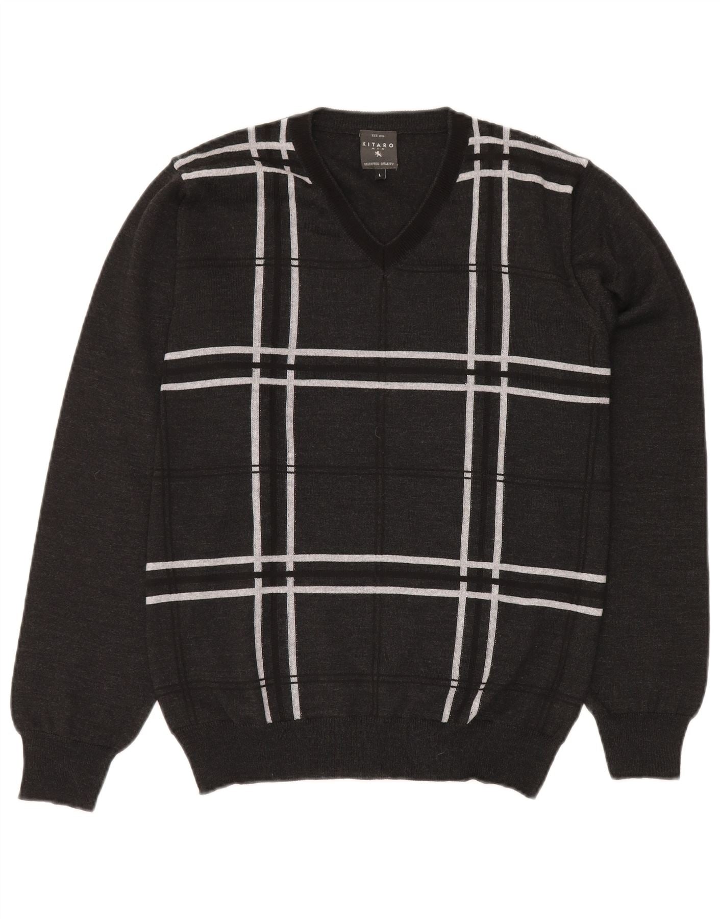 KITARO Mens V-Neck Jumper Sweater Large Grey Check Wool