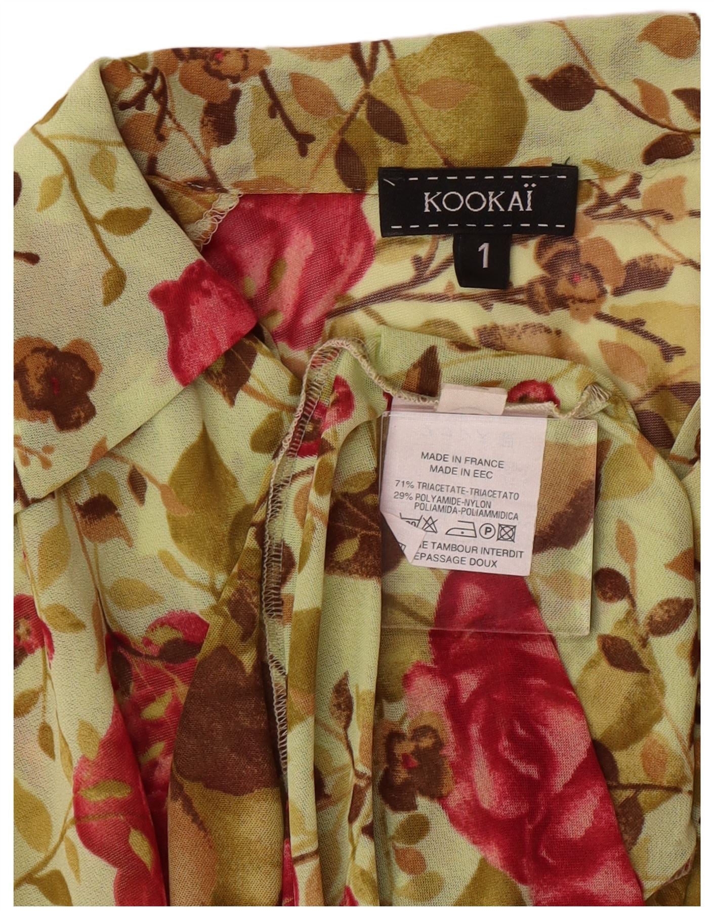 - AI Description: This Kookai women's shirt dress features a green floral pattern on rayon fabric. The collared neckline and button-up closure add a bohemian touch. Long sleeves and a regular fit offer effortless style. Lined for comfort, this dress, made in France, combines classic design with a fresh, floral aesthetic.