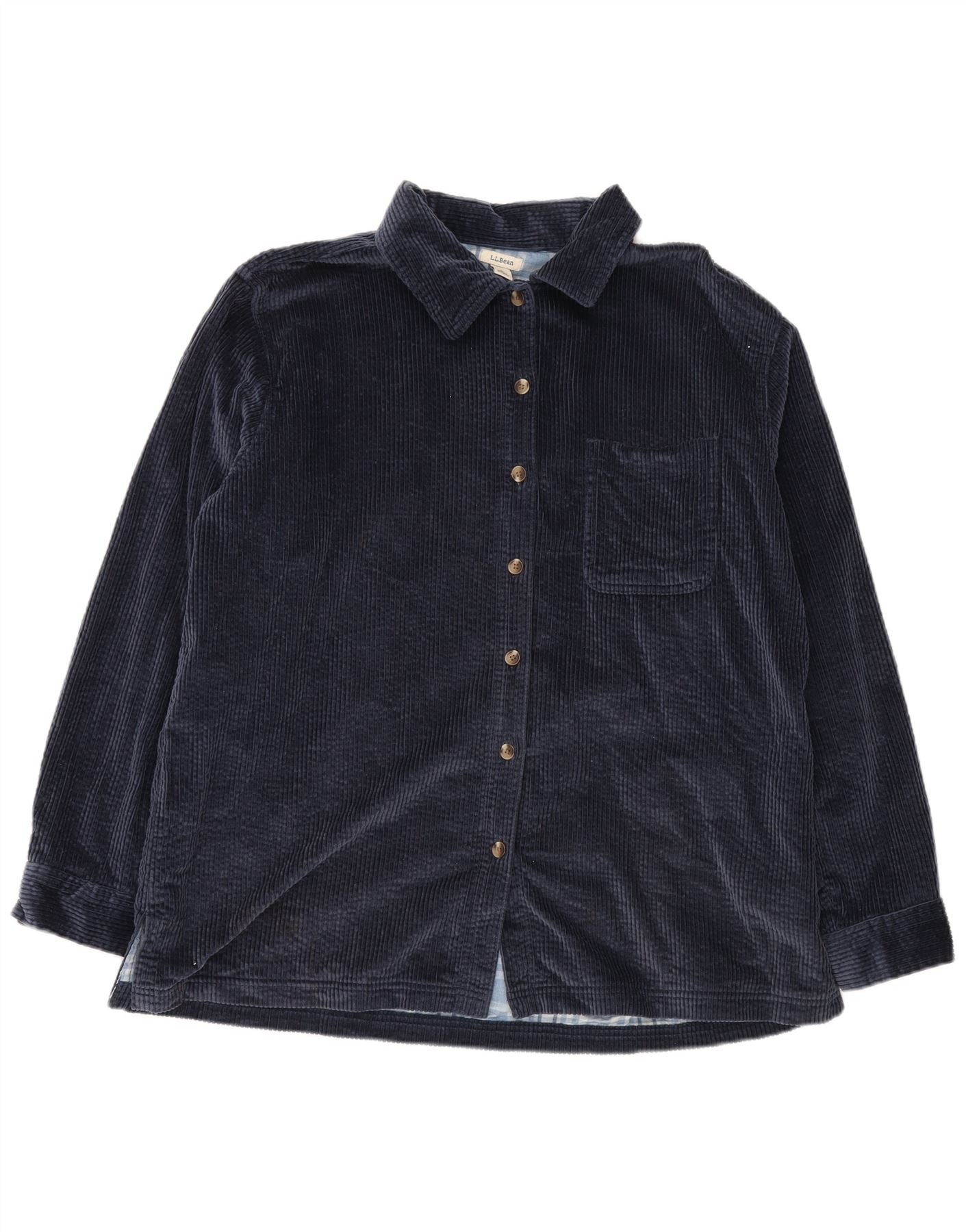 - AI Description: This L.L.Bean mens corduroy shirt is crafted from soft navy blue 100 percent cotton. It features a classic collared neckline and long sleeves. The full button-up front and regular fit offer timeless appeal. A single chest pocket adds practical detail. Tonal buttons complete the classic design, ensuring a smart, versatile look for any casual occasion.