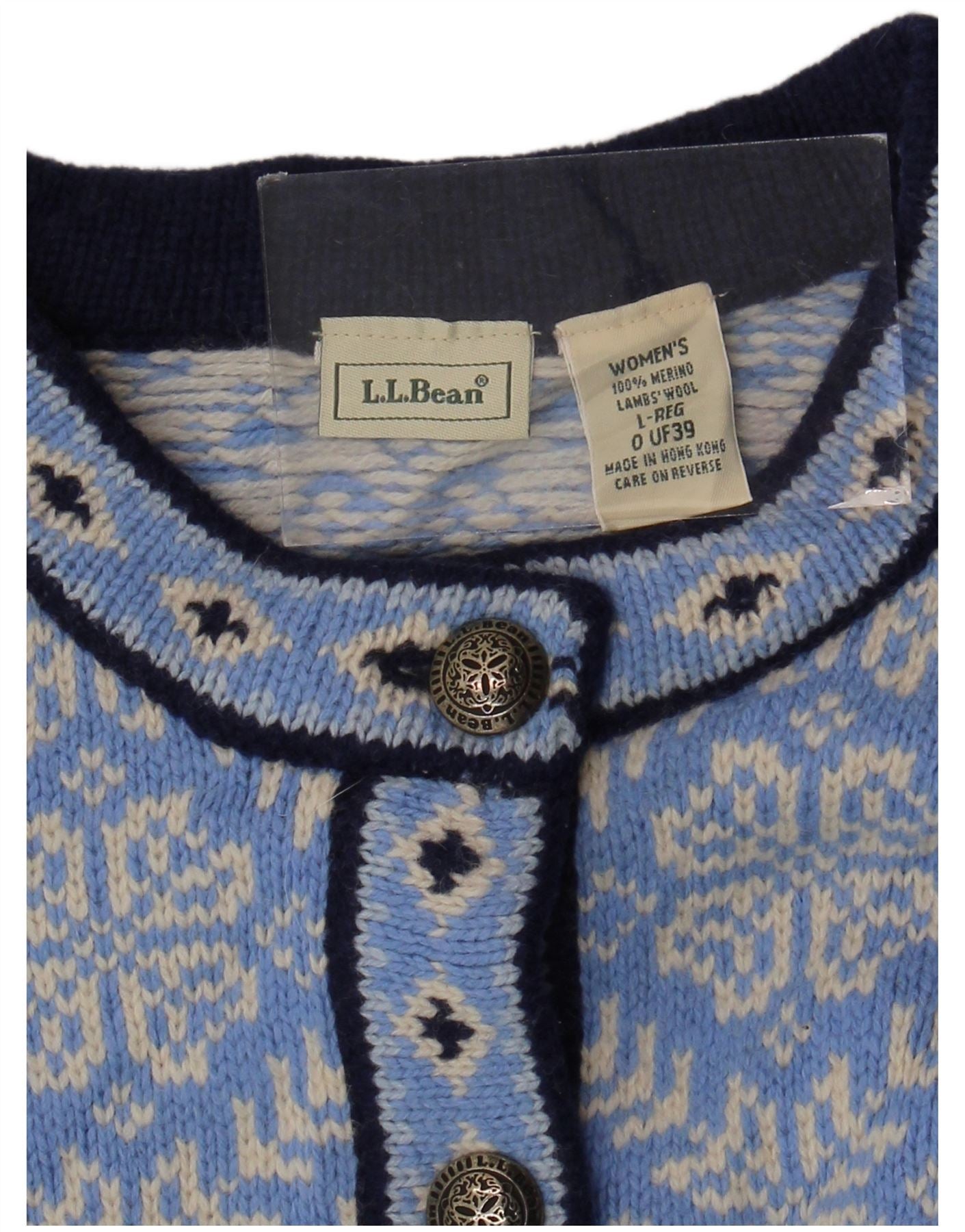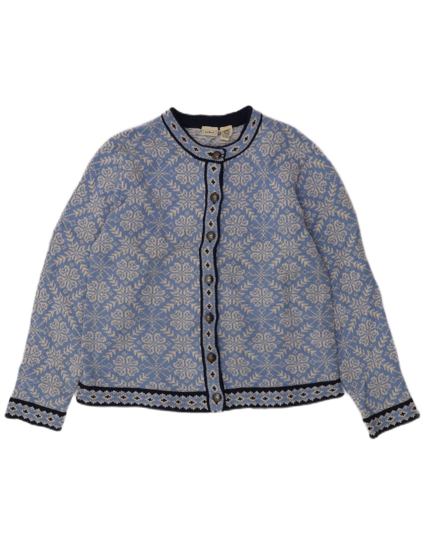 L.L.BEAN Womens Cardigan Sweater UK 16 Large Blue Fair Isle Merino Wool