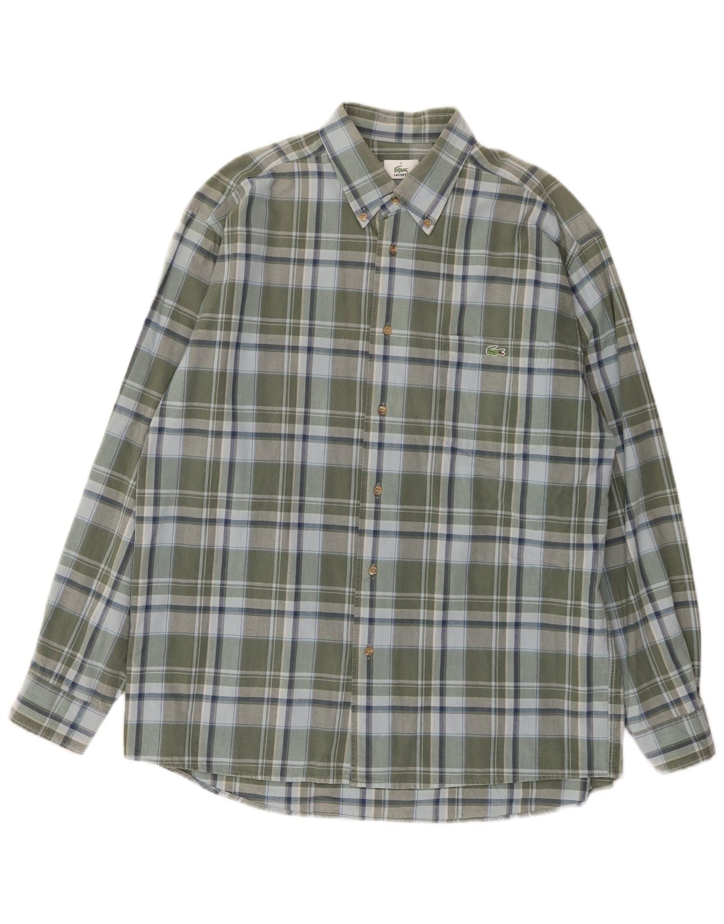 - AI Description: This Lacoste mens shirt is crafted from 100 percent woven cotton, offering a comfortable and breathable feel. It features a classic collared neckline and a full button-up front. The multicoloured plaid pattern in green, blue, and grey provides a timeless checked design. Long sleeves with buttoned cuffs and a regular fit ensure a smart yet relaxed silhouette. A subtle logo accent completes this versatile piece, perfect for everyday wear.