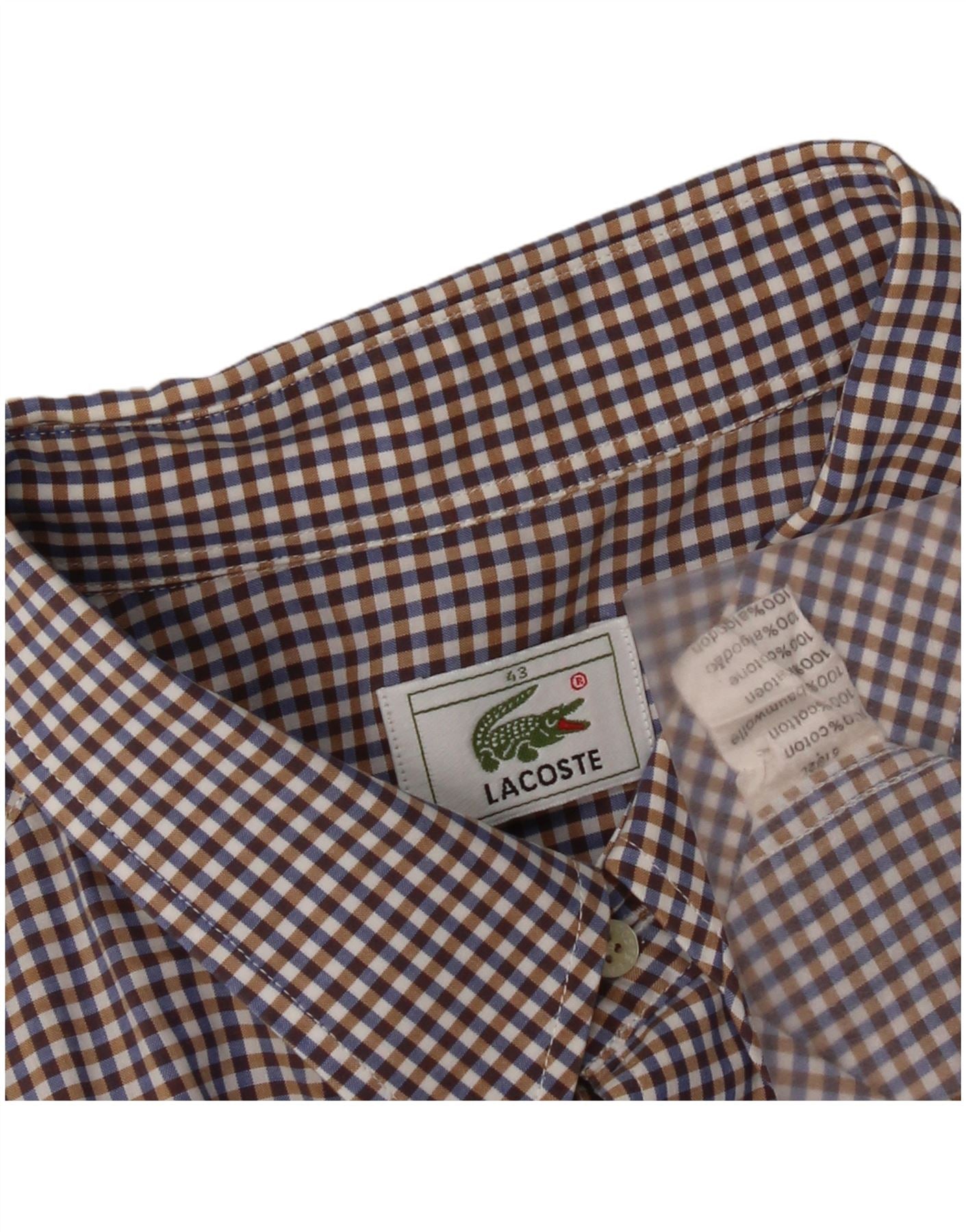 - AI Description: This Lacoste mens shirt is crafted from 100 percent woven cotton, offering a comfortable feel. It features a classic gingham check pattern in a multicoloured palette of blue, brown, and white. The collared neckline and button closure provide a smart, timeless look. Short sleeves and a regular fit ensure ease of wear. A subtle logo accent adds signature branding. This shirt includes practical pockets for convenience.