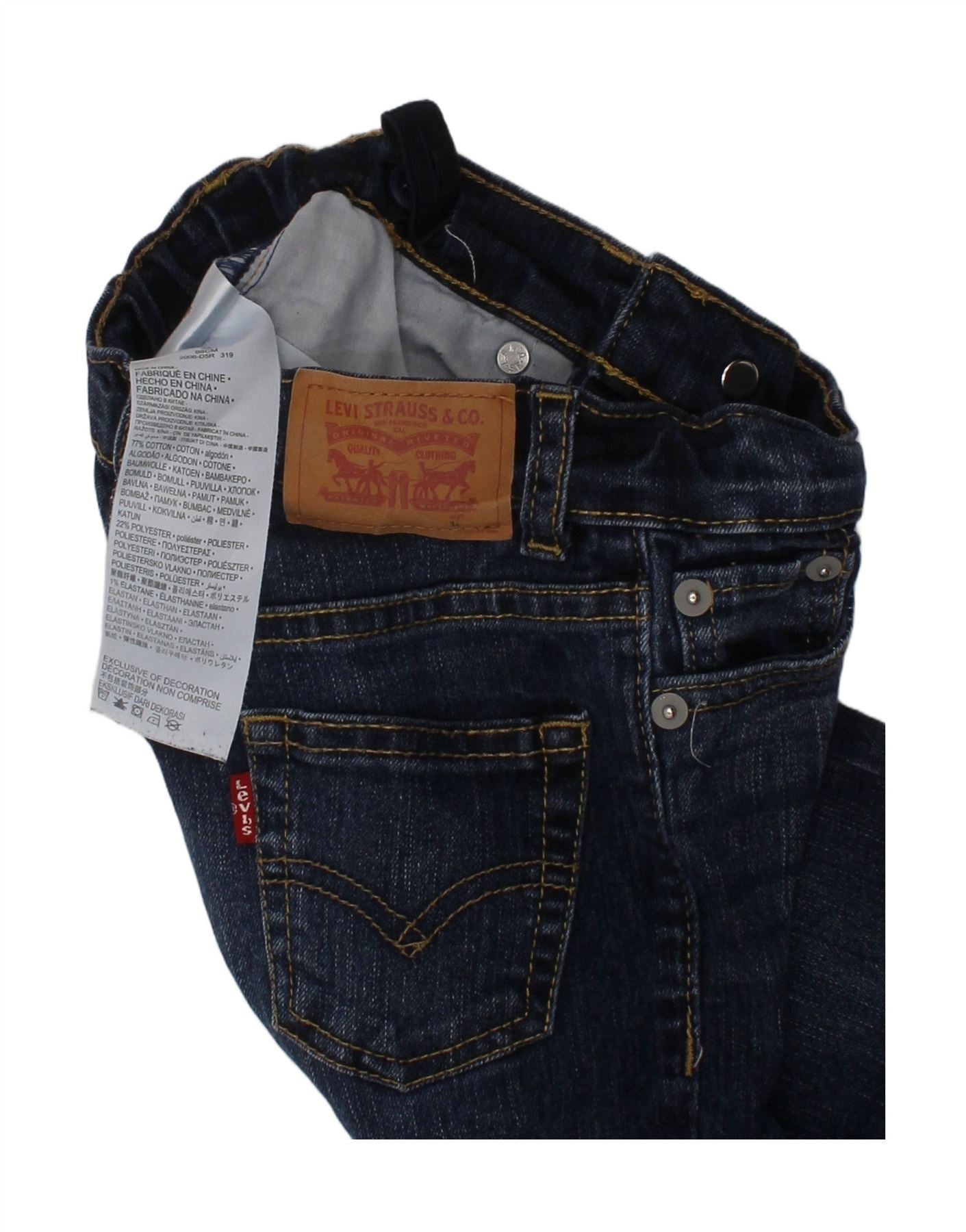 - AI Description: This Levi's boys' straight jeans are crafted from durable navy blue denim. The fabric blend of cotton, polyester, and elastane offers excellent stretch and comfort. They feature a regular fit with a classic straight leg, providing a timeless silhouette. An elasticated waist enhances wearability, complemented by a secure button closure. Practical pockets complete the design, making these a versatile wardrobe essential for everyday wear.