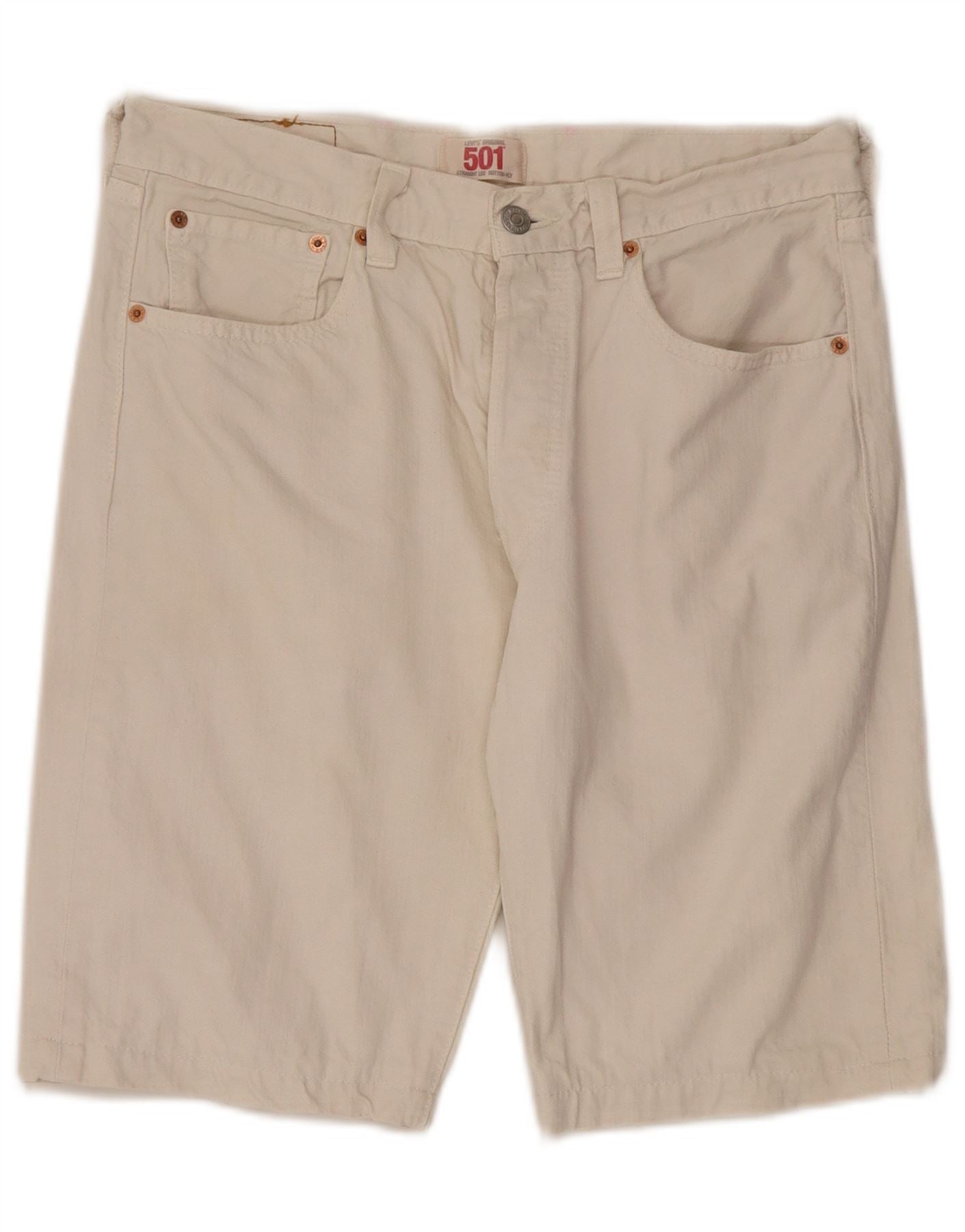 - AI Description: This Levis mens Denim Shorts are crafted from 100 percent cotton denim in a versatile off white shade. They feature a classic button closure and a comfortable regular fit. Practical pockets offer everyday utility. A subtle brand logo provides a signature touch. The timeless 501 style ensures enduring appeal.