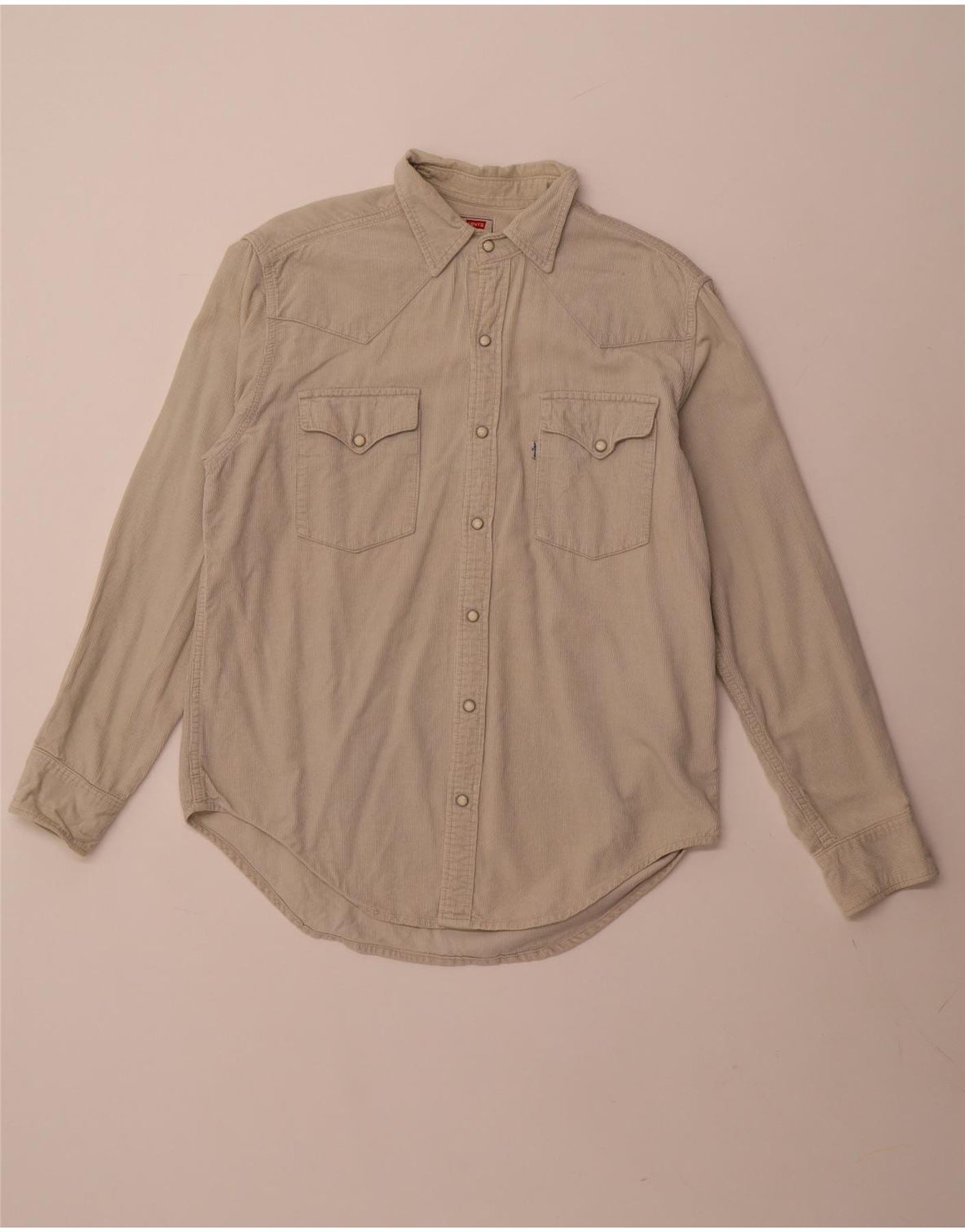 - AI Description: This Levi's mens shirt is crafted from soft beige corduroy, offering a distinctive ribbed texture. It features a classic collared neckline and long sleeves with snap cuffs. The Western style is evident with front and back yokes and twin chest pockets, secured by snap closures. A regular fit ensures comfortable wear. This piece combines rugged charm with everyday practicality.