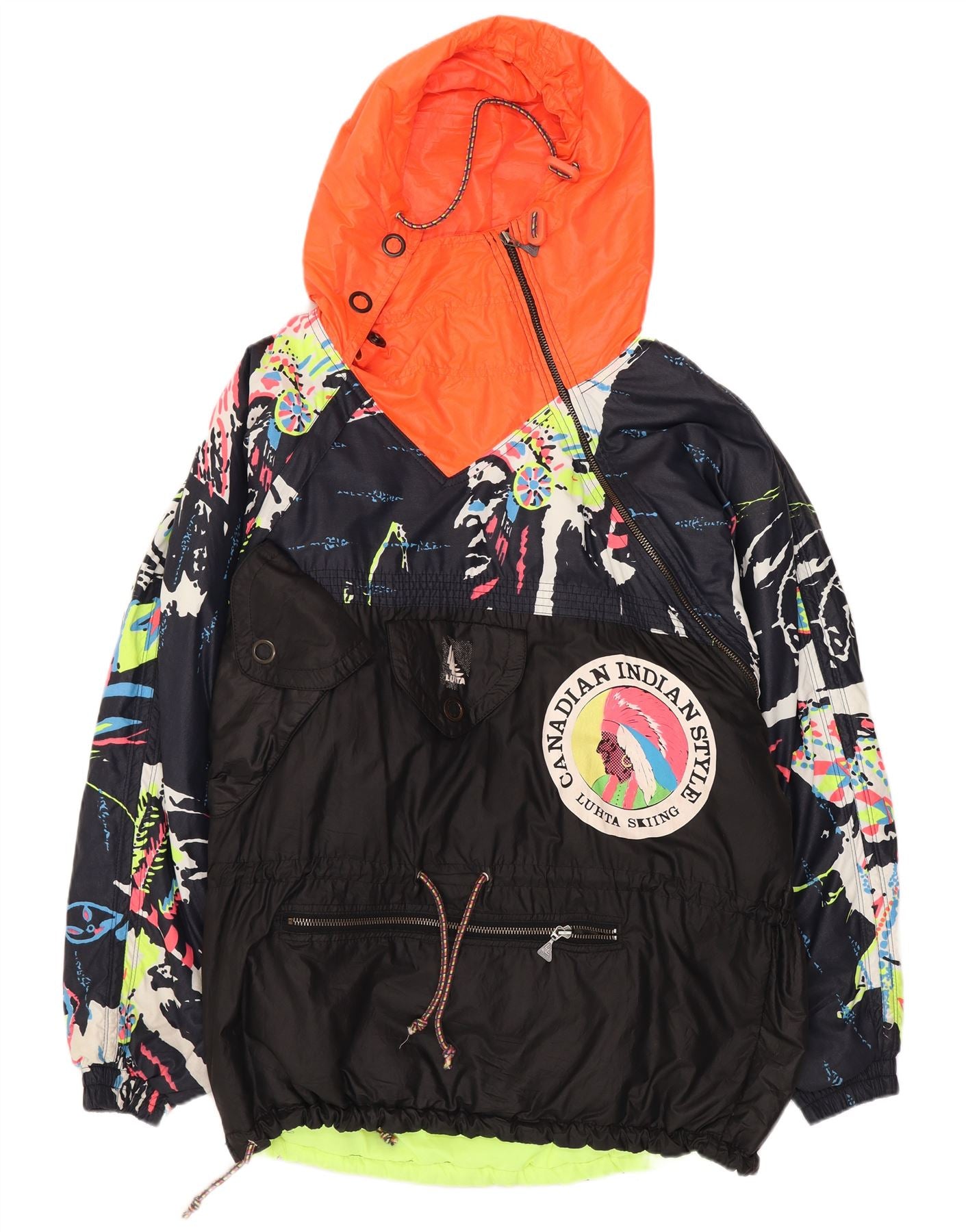 - AI Description: This Luhta mens anorak jacket is crafted from 100 percent polyamide microfibre, offering a lightweight feel. It features a vibrant multicoloured geometric pattern with a striking orange hood and high neck. The pullover design includes long sleeves and an adjustable waist for a regular fit. Practical pockets and a distinctive logo accent complete this 90s inspired piece.