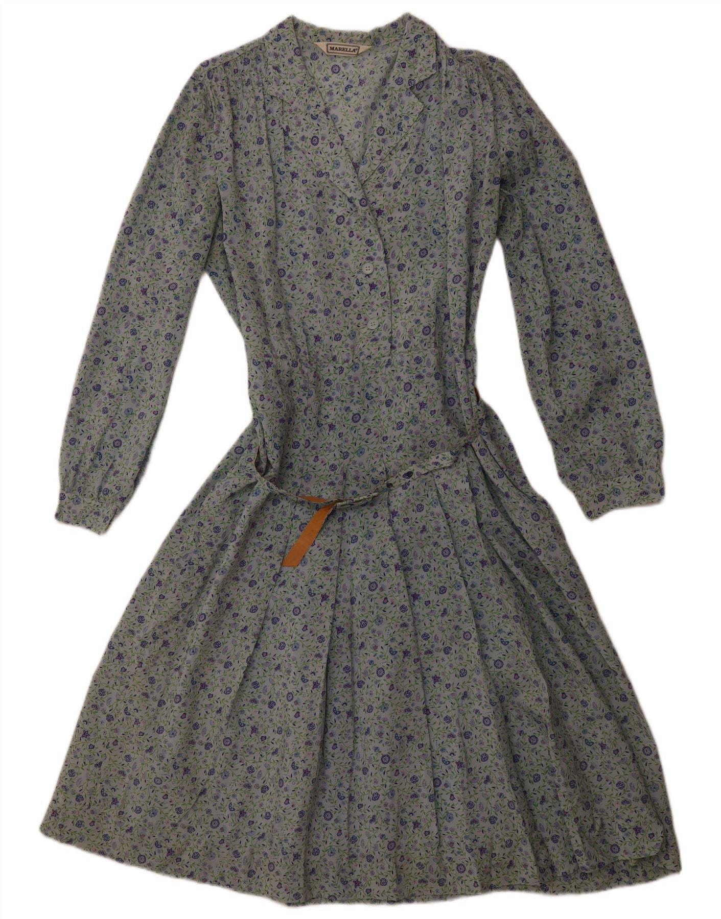 - AI Description: This Marella womens shirt dress is crafted from a flowing blended fabric, featuring a vibrant multicoloured floral pattern. It boasts a classic collared neckline and a full button-up front. Long sleeves and a regular fit ensure comfortable wear. A matching belt with a buckle accent cinches the waist, creating a flattering silhouette. The design offers a sophisticated yet relaxed style, perfect for various occasions.