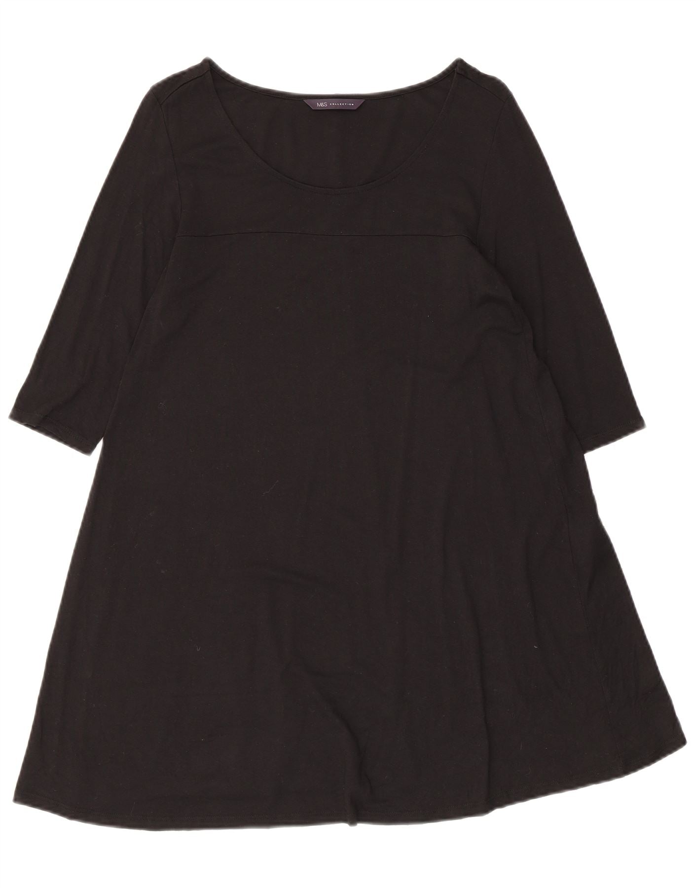 - AI Description: This Marks & Spencer womens swing dress is crafted from a soft black viscose blend with added stretch. It features a classic round neckline and comfortable 3/4 length sleeves. The relaxed, loose fit drapes gracefully, creating a flattering A-line silhouette. This pullover style offers effortless wear and versatile styling for any occasion.