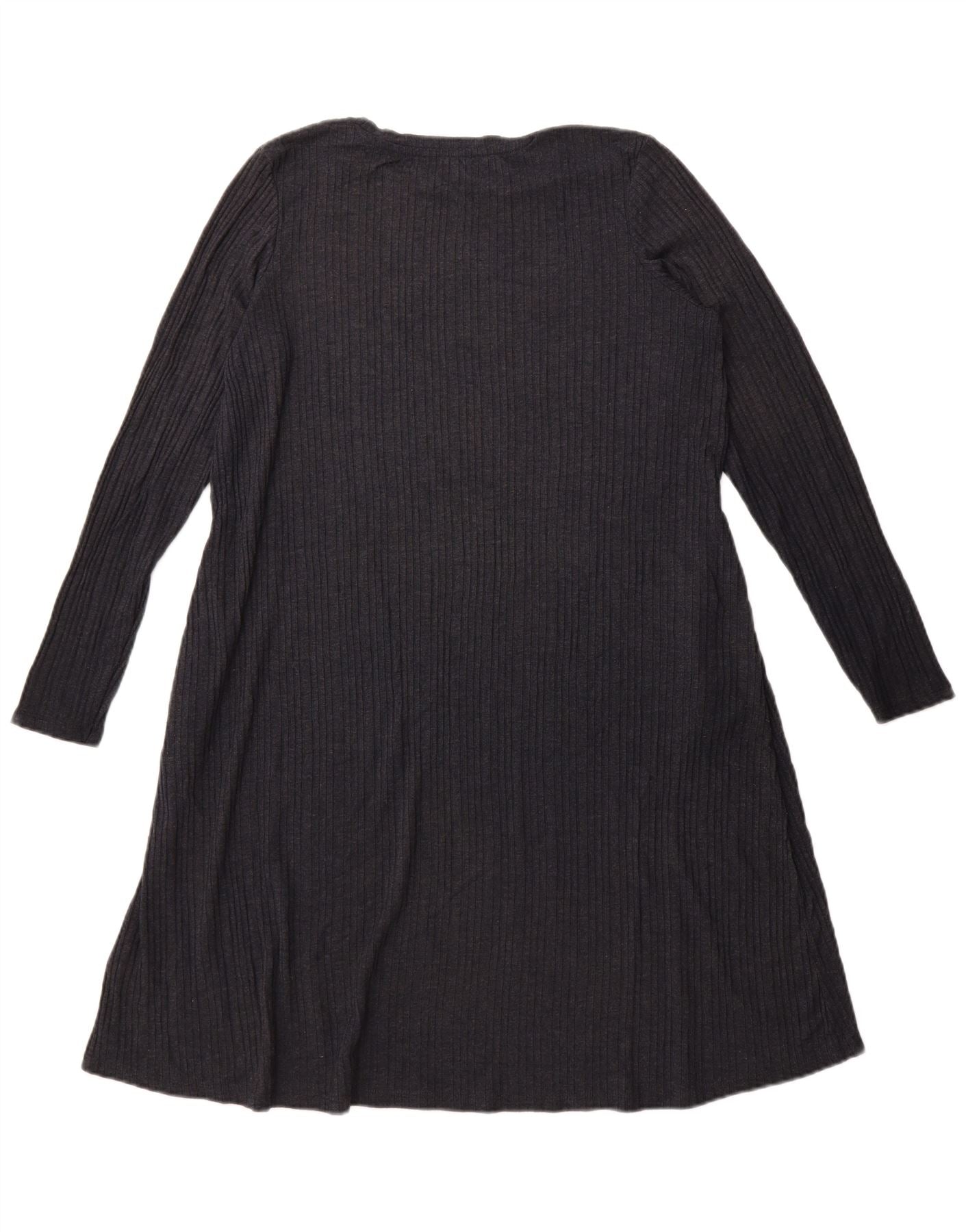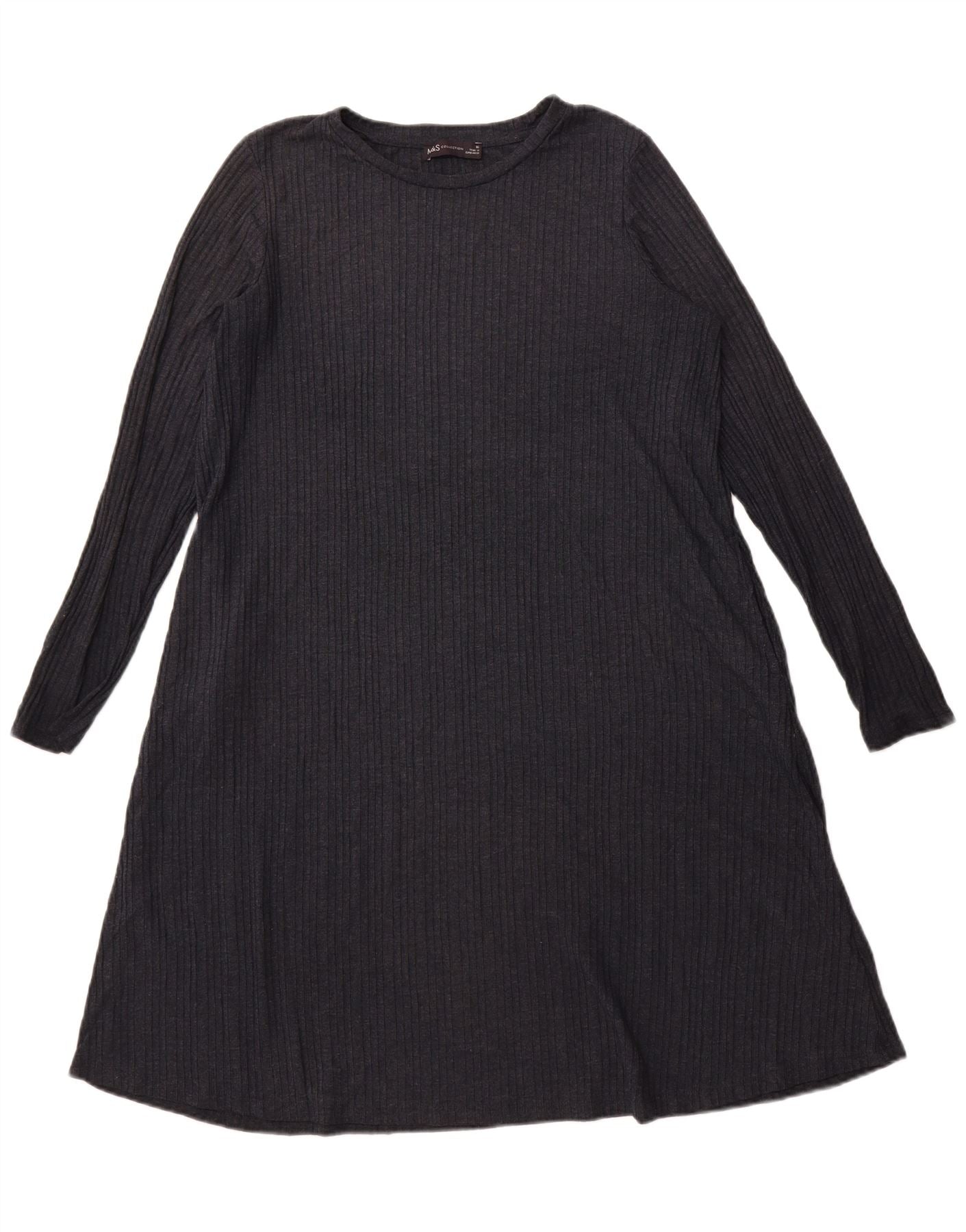 - AI Description: This Marks & Spencer womens A-line dress is crafted from a comfortable grey ribbed knit fabric. The blend of polyester and viscose offers a soft feel with stretch for ease. It features a classic round neckline and long sleeves. The relaxed fit gently flares into an A-line silhouette, ensuring comfort and a flattering drape. This pullover style is simple yet elegant.