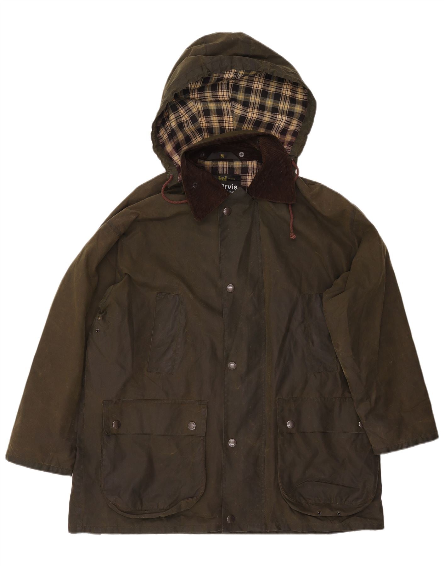 MC ORVIS Mens Hooded Loose Fit Waxed Jacket UK 38 Medium Khaki Cotton