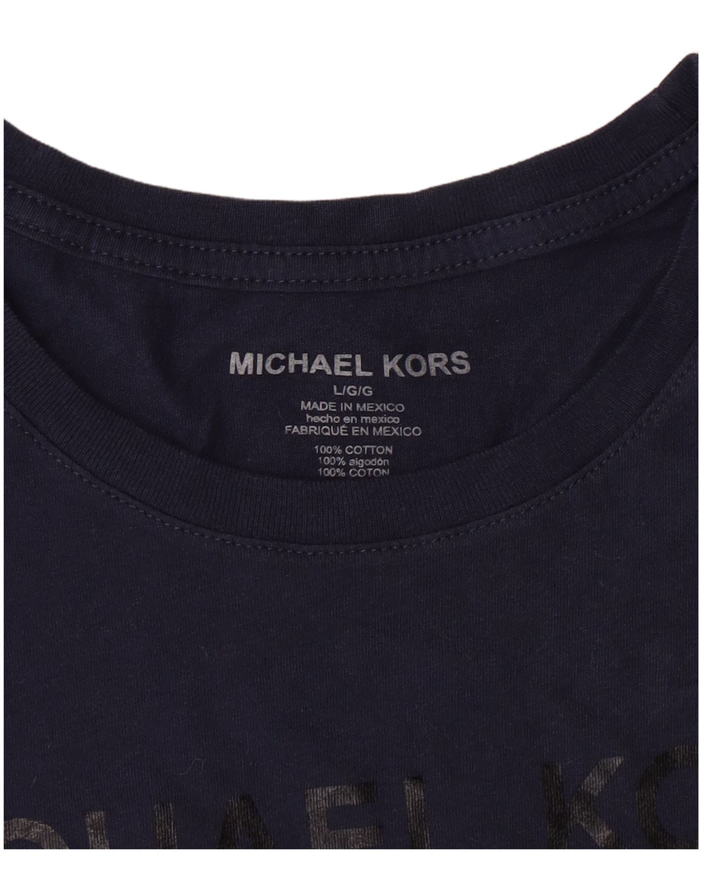 - AI Description: This Michael Kors men's T-shirt is crafted from soft navy blue cotton jersey. It features a classic round neck and short sleeves for everyday wear. The regular fit ensures a comfortable silhouette. A graphic logo is emblazoned across the chest, adding a signature branded accent to this casual staple.