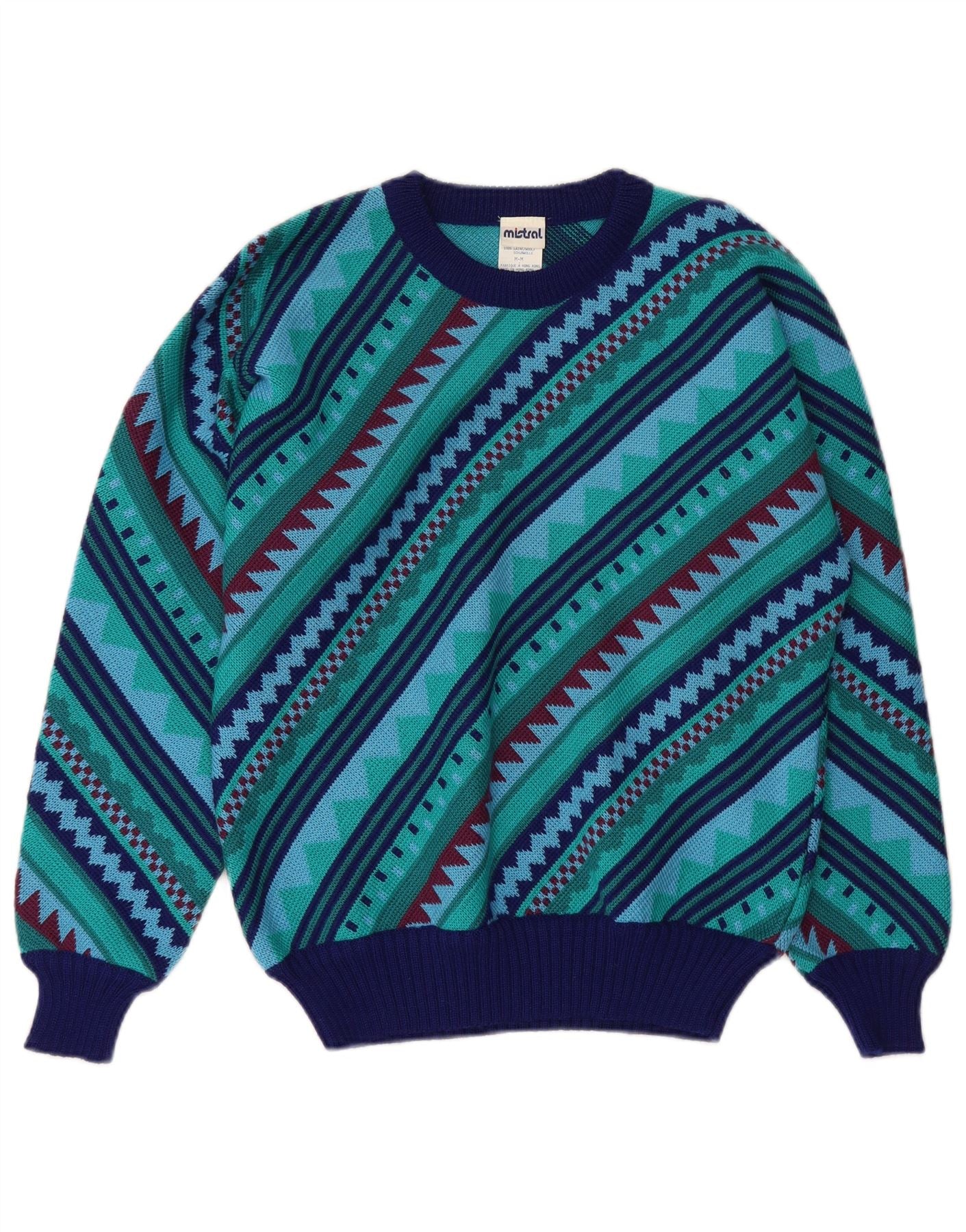 MISTRAL Mens Boat Neck Jumper Sweater Medium Navy Blue Geometric Wool