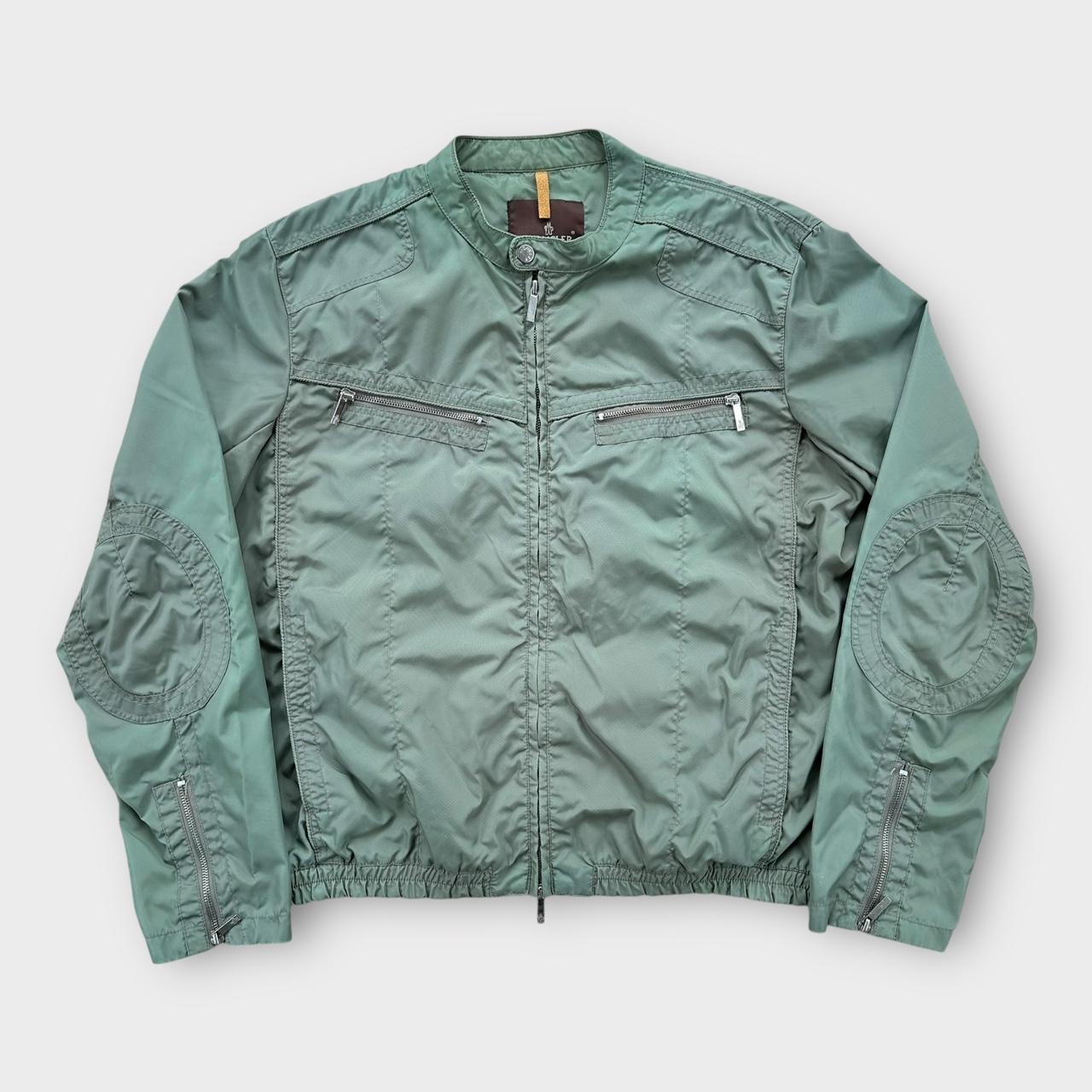 Early 2000’s Moncler biker style zip up jacket in green with multiple pockets and details throughout