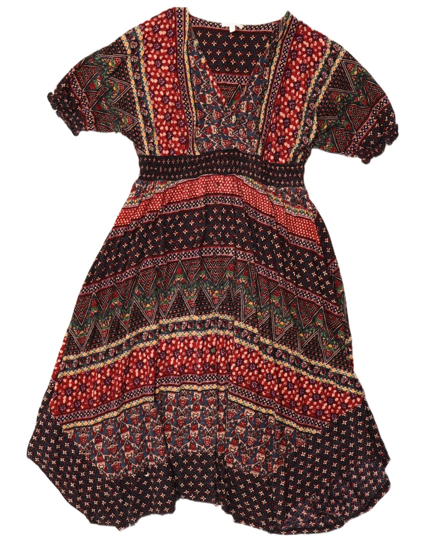 - AI Description: This Monsoon womens Empire Dress is crafted from a lightweight woven fabric, offering a comfortable, relaxed fit. It features a vibrant multicoloured geometric pattern, blending rich reds, blues, and blacks. The V-neckline and short sleeves frame the upper body. An empire waist cinches gently, flowing into a relaxed skirt. The pullover style ensures ease of wear, embodying a bohemian charm.