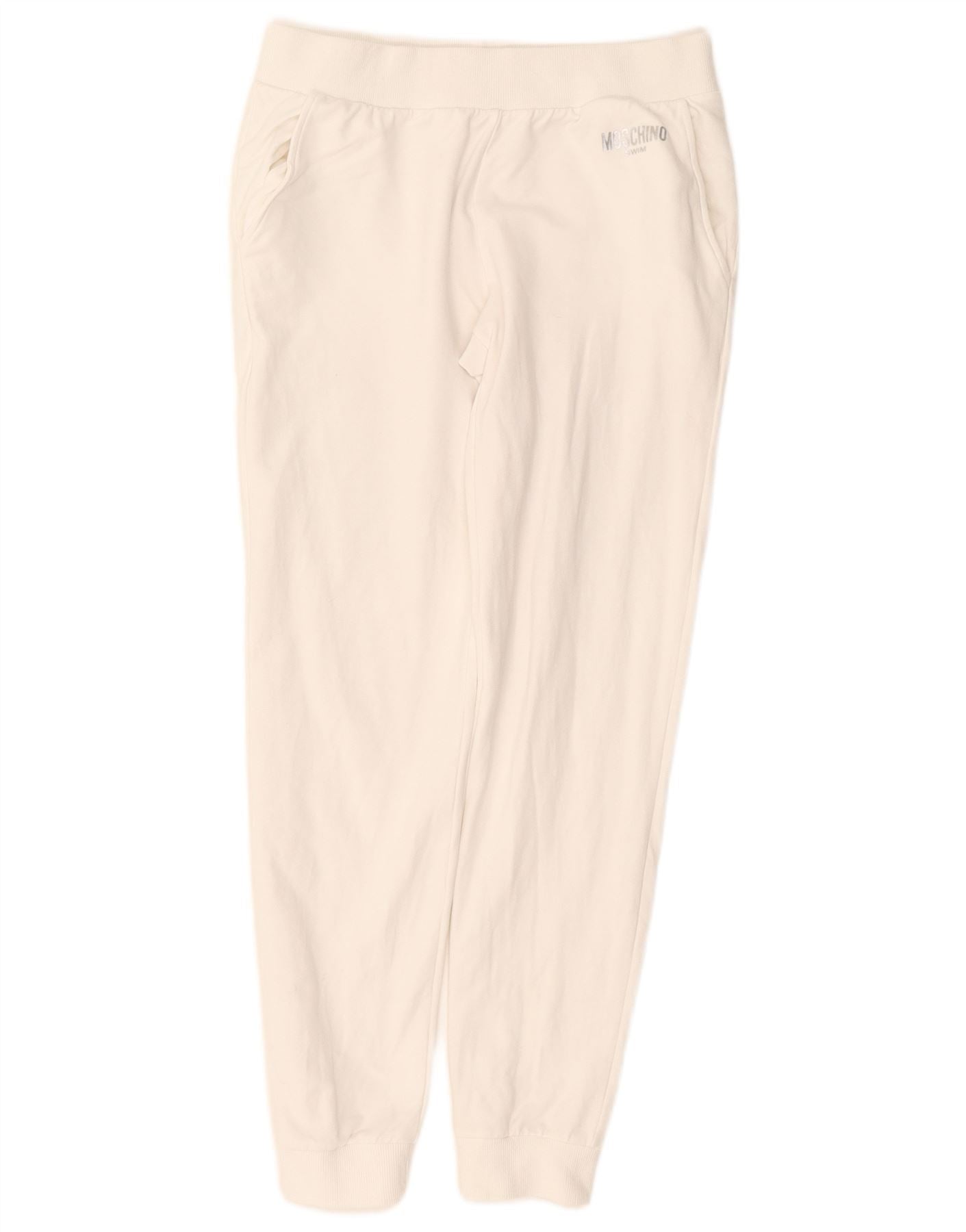 - AI Description: This Moschino womens casual trousers are crafted from a soft off white cotton jersey blend, offering comfort and flexibility. They feature a relaxed fit with an elasticated pull on waist for ease. The jogger style provides a contemporary silhouette. Practical pockets add functionality. A subtle logo accent completes the designer look. This versatile piece is perfect for relaxed styling.