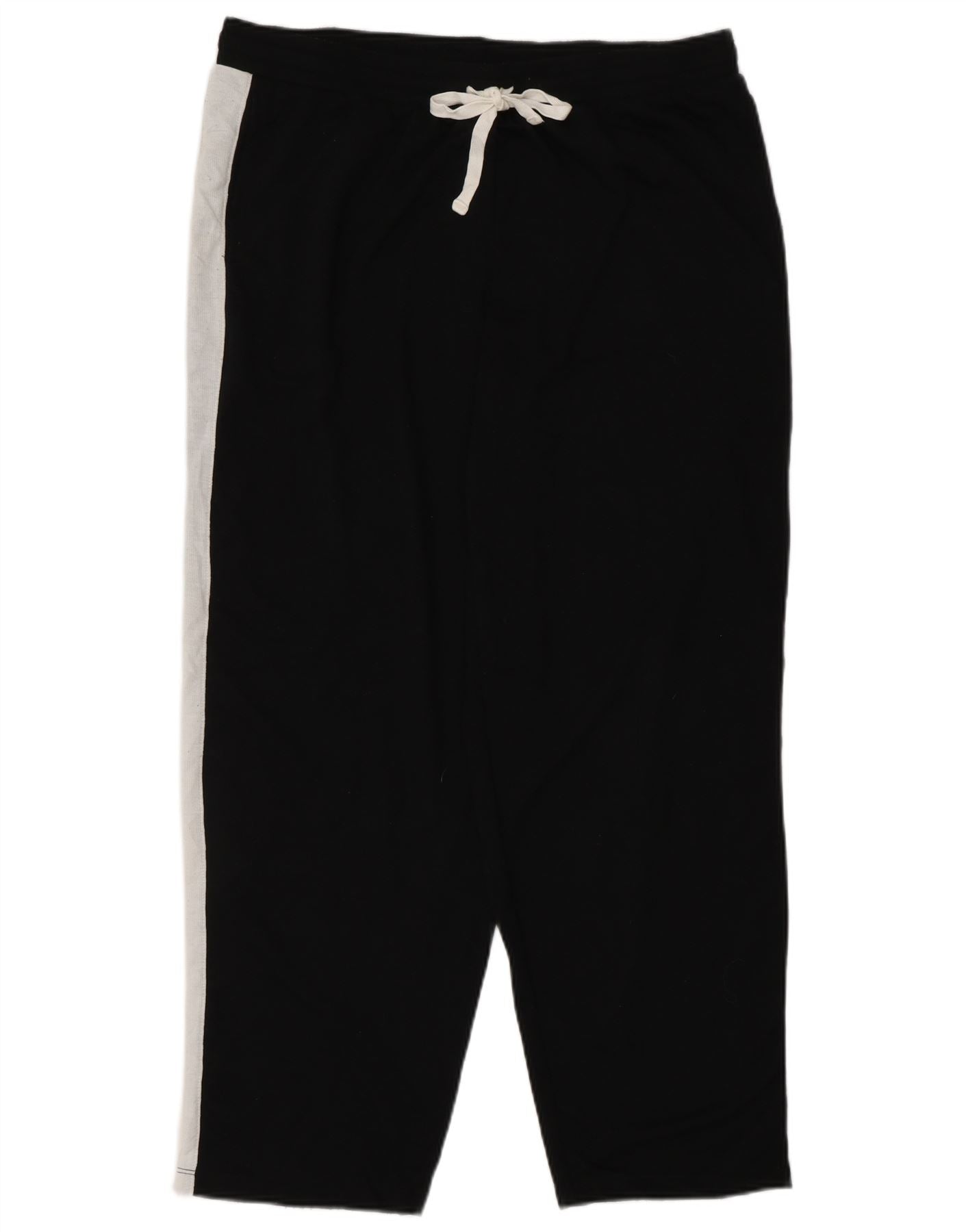- AI Description: These Nautica women's cropped trousers are crafted from soft black polyester jersey. They feature a comfortable elasticated waist with a white drawstring closure. The relaxed fit offers ease of movement. White side stripes run down each leg, adding a sporty contrast. Practical pockets are included. The cropped length finishes neatly.