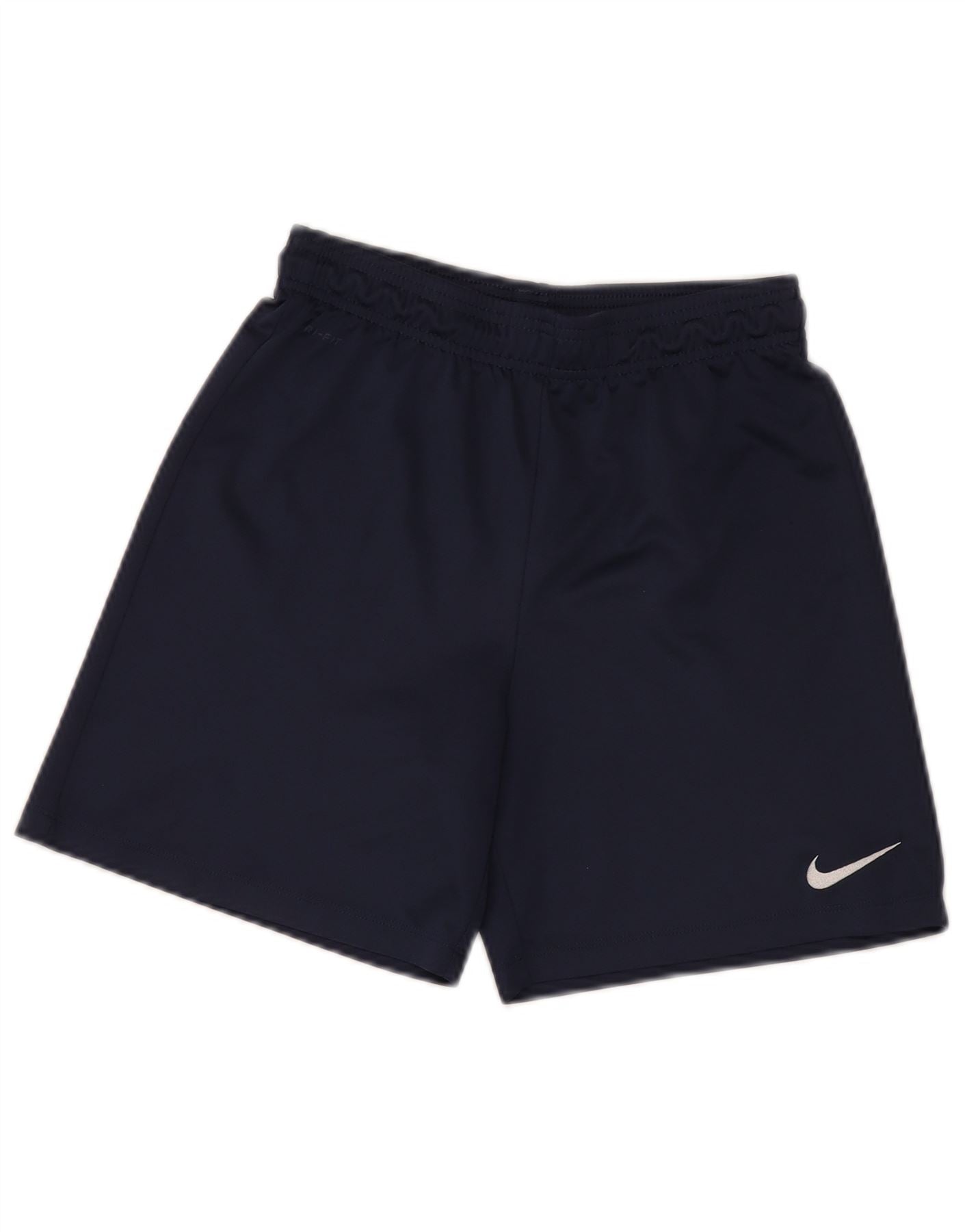 - AI Description: These Nike boys shorts are crafted from lightweight navy blue polyester jersey, featuring Nike's Dri-FIT technology for comfort. They have a regular fit and a pull-on elastic waist for ease of wear. A subtle white Nike logo is placed on the leg. Ideal for football or other sports, these shorts offer comfort and freedom of movement for active youngsters.