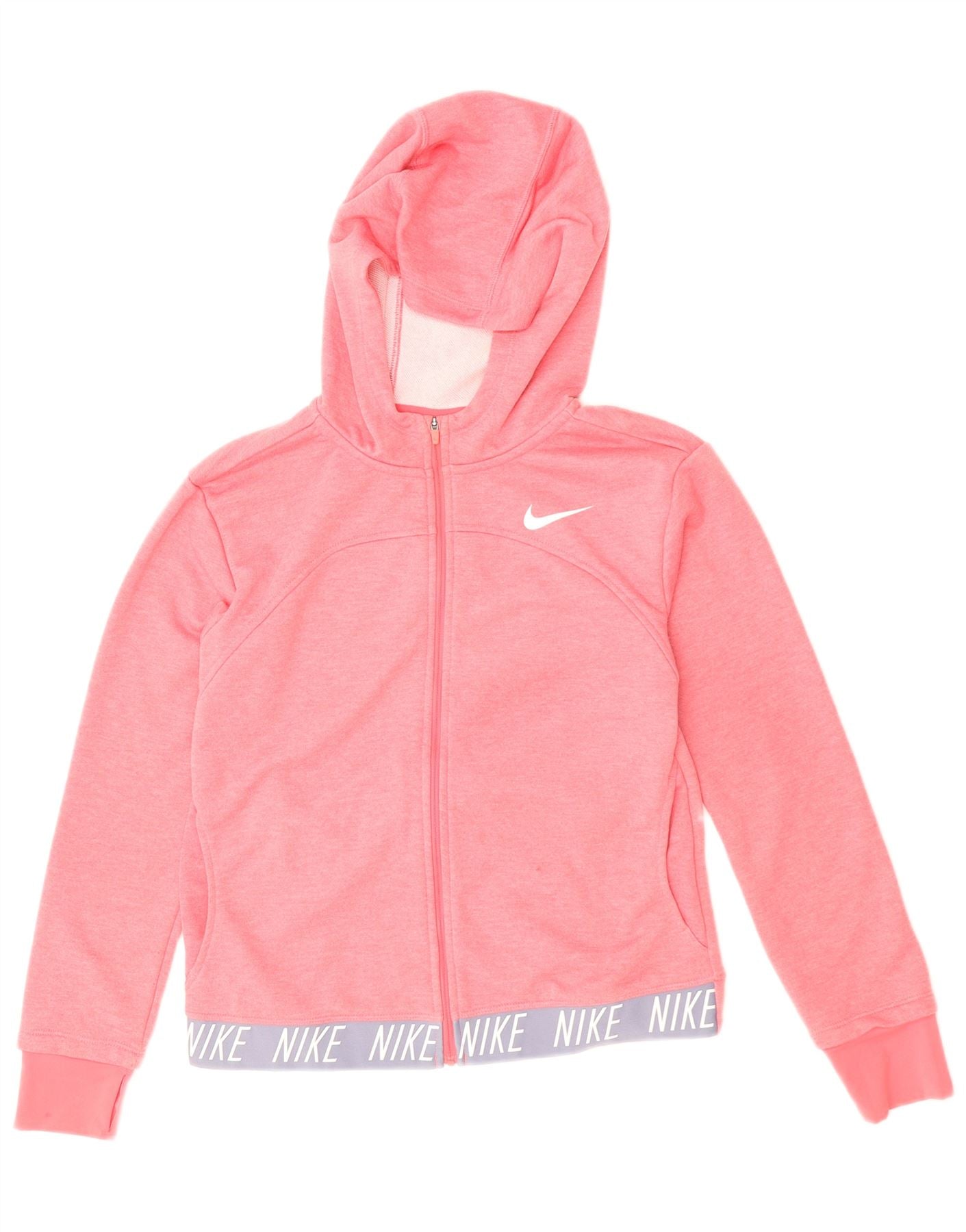 NIKE Girls Dri Fit Zip Hoodie Sweater 13-14 Years XL Pink Colourblock