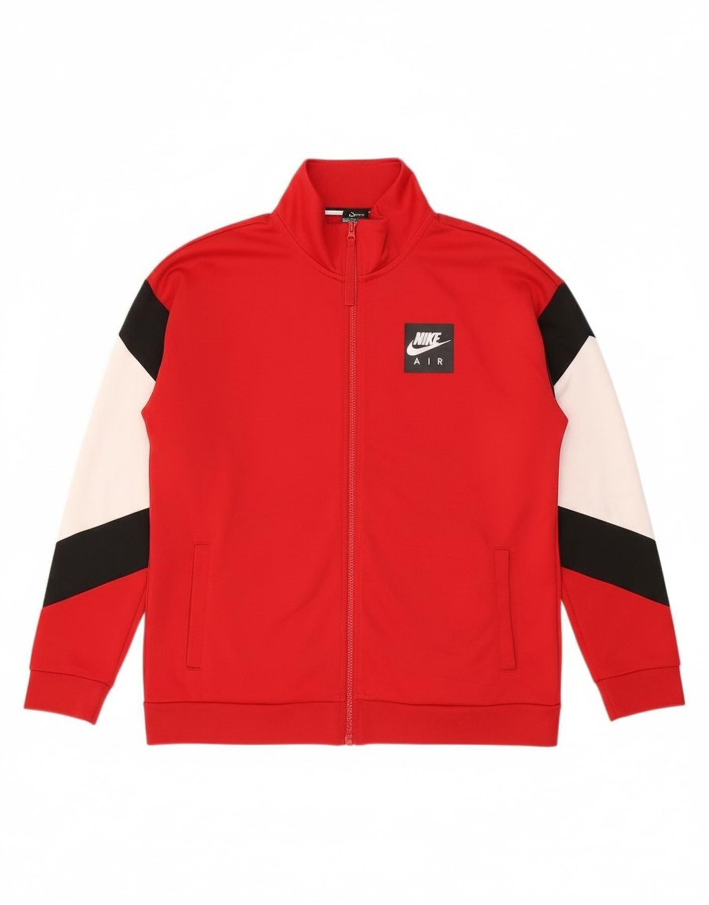 - AI Description: This Nike mens Tracksuit Top Jacket is crafted from smooth woven polyester for a comfortable feel. It features a collared neckline and a full zip closure. Long sleeves and a regular fit ensure ease of movement. The vibrant red body is accented with striking black and white colourblock panels. A prominent Nike Air logo adds a signature sports touch. Practical pockets are included for convenience.