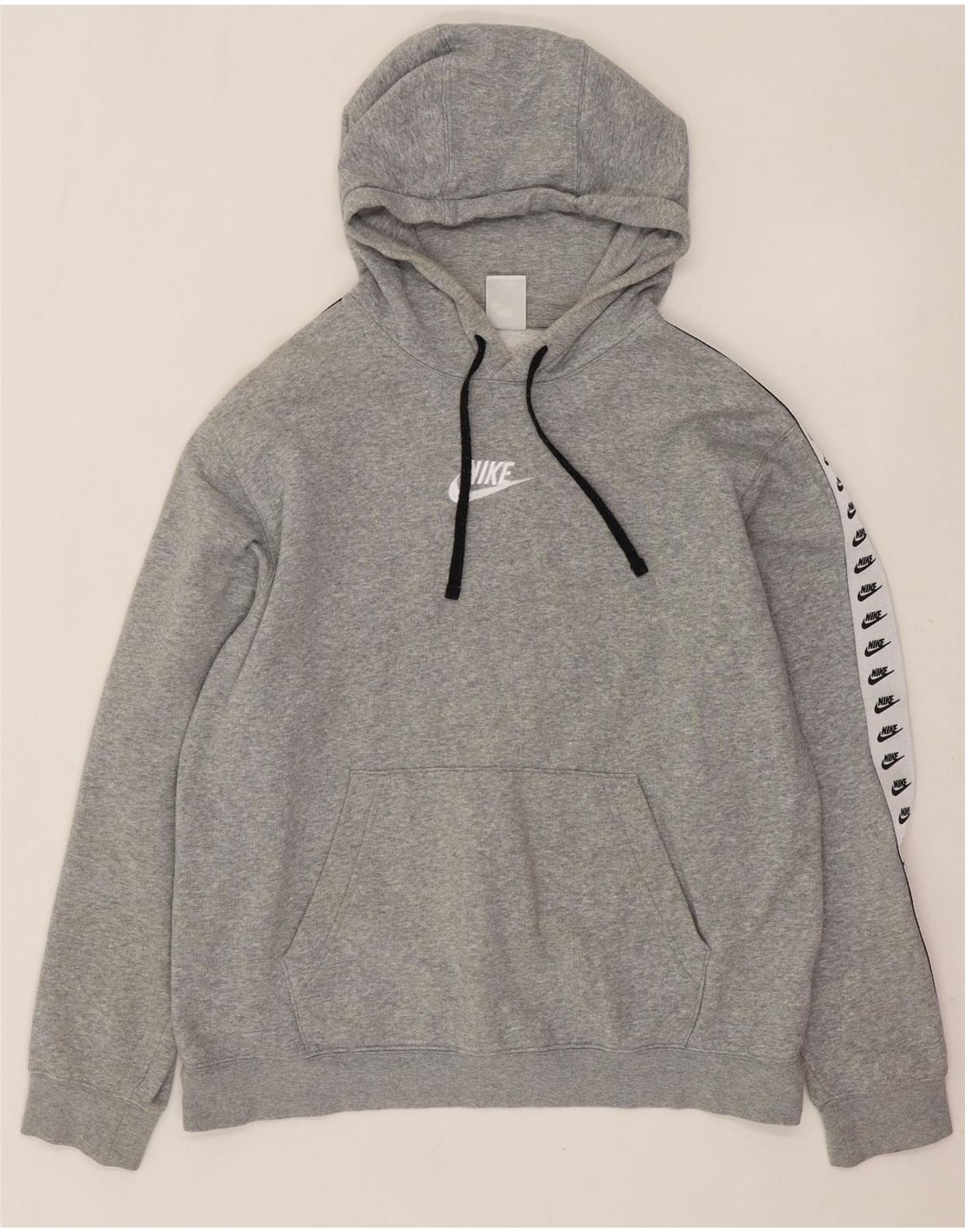 - AI Description: This Nike mens hoodie jumper is crafted from a soft grey cotton and polyester blend. It features a classic pullover design with a comfortable regular fit. The hooded neckline includes adjustable drawstrings for a custom feel. Long sleeves are detailed with a repeated logo tape, adding a distinctive accent. A practical kangaroo pocket sits at the front, enhancing its casual appeal.
