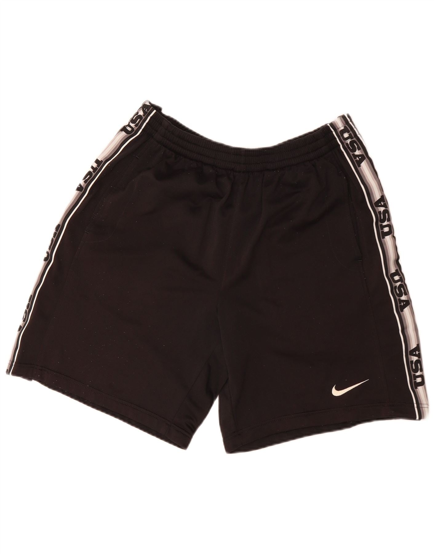 - AI Description: This Nike mens sports shorts are crafted from smooth black polyester jersey. They feature an athletic regular fit with an elasticated pull-on waist. Side stripes with USA text and a Nike logo add distinctive branding. Practical pockets enhance functionality. The design offers comfort and style for active wear.