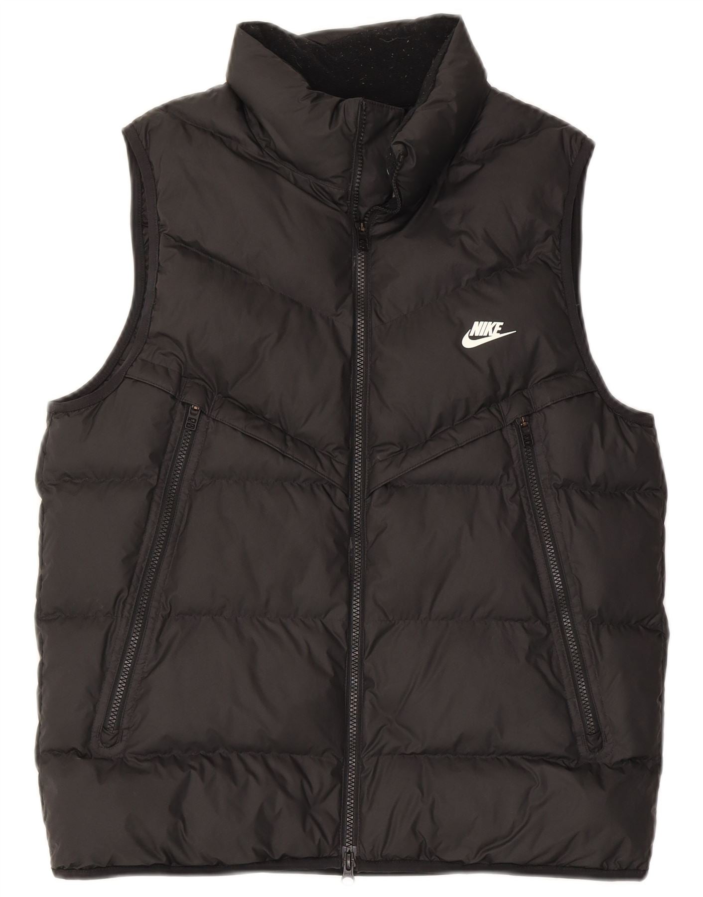 - AI Description: This Nike mens waistcoat is crafted from black down fabric, featuring a quilted design for warmth. It offers a regular fit with a collared neckline and a full zip closure. Sleeveless for ease of movement, it includes practical pockets and a windproof finish. A subtle logo accent completes the sports style.
