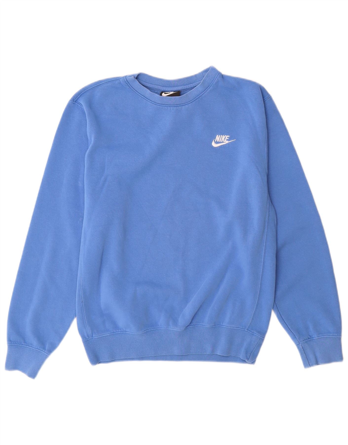 - AI Description: This Nike mens sweatshirt jumper is crafted from soft blue jersey fabric, offering comfort and a smooth feel. It features a classic round neck and long sleeves with cuffed wrists. The regular fit ensures a comfortable silhouette. An embroidered Nike logo subtly accents the chest. This versatile piece is ideal for everyday wear, blending athletic style with casual ease.