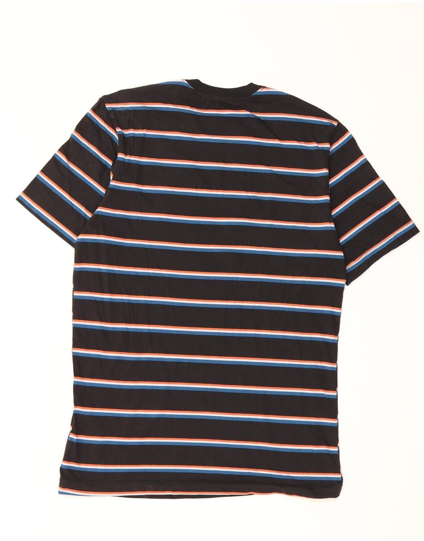 - AI Description: This Nike mens Graphic T-Shirt Top is crafted from soft 100 percent cotton jersey. It features a classic black base with a vibrant striped pattern in blue, white, and orange. The round neck and short sleeves offer a timeless, comfortable fit. A subtle Nike logo on the chest adds signature branding. This pullover style ensures effortless wear and a regular fit.