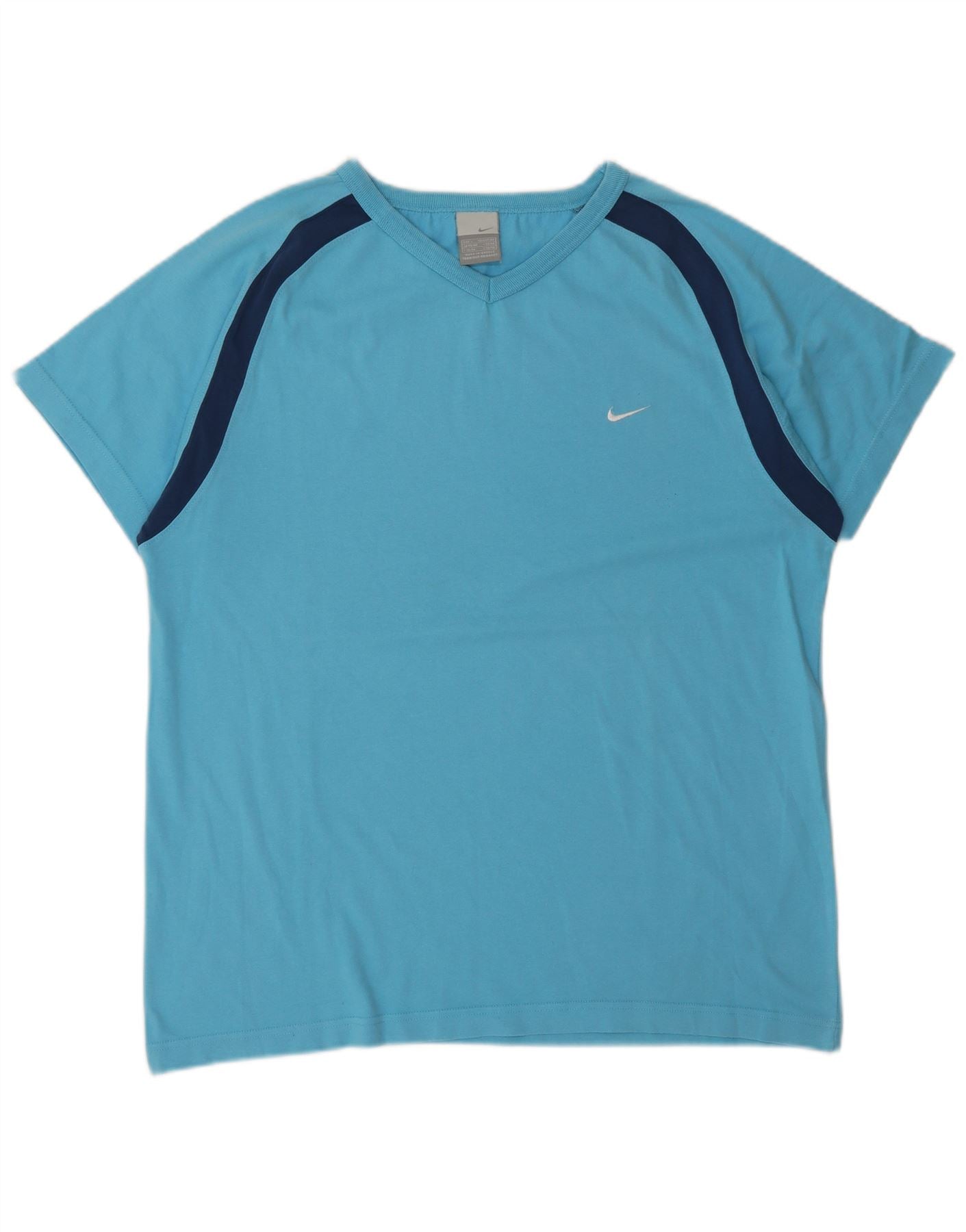 - AI Description: This Nike mens T-shirt is crafted from blue Nike Dri-Fit jersey fabric. It features a classic V-neckline and short sleeves. The regular fit ensures comfort and ease of movement. Dark blue panels accent the shoulders, adding a sporty contrast. A subtle Nike logo is positioned on the chest. This pullover style is ideal for sports or casual wear.