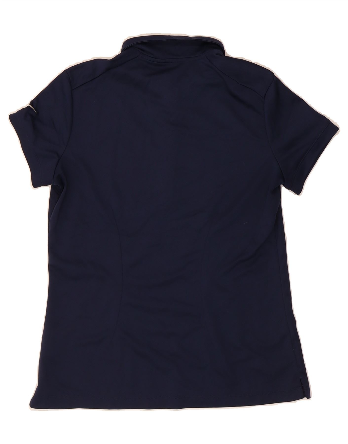 - AI Description: This Nike women's polo shirt in navy blue is crafted from 100% polyester with Dri-FIT technology, ensuring breathable comfort during active wear. Featuring a classic fit and short sleeves, it offers a regular silhouette with a buttoned collar for a polished look. The double-breasted design adds a subtle touch of sophistication, while the iconic Nike logo accentuates its sporty style. Ideal for golf or casual sportswear, this pre-owned shirt is machine washable and tumble dry safe, combining performance with effortless style.