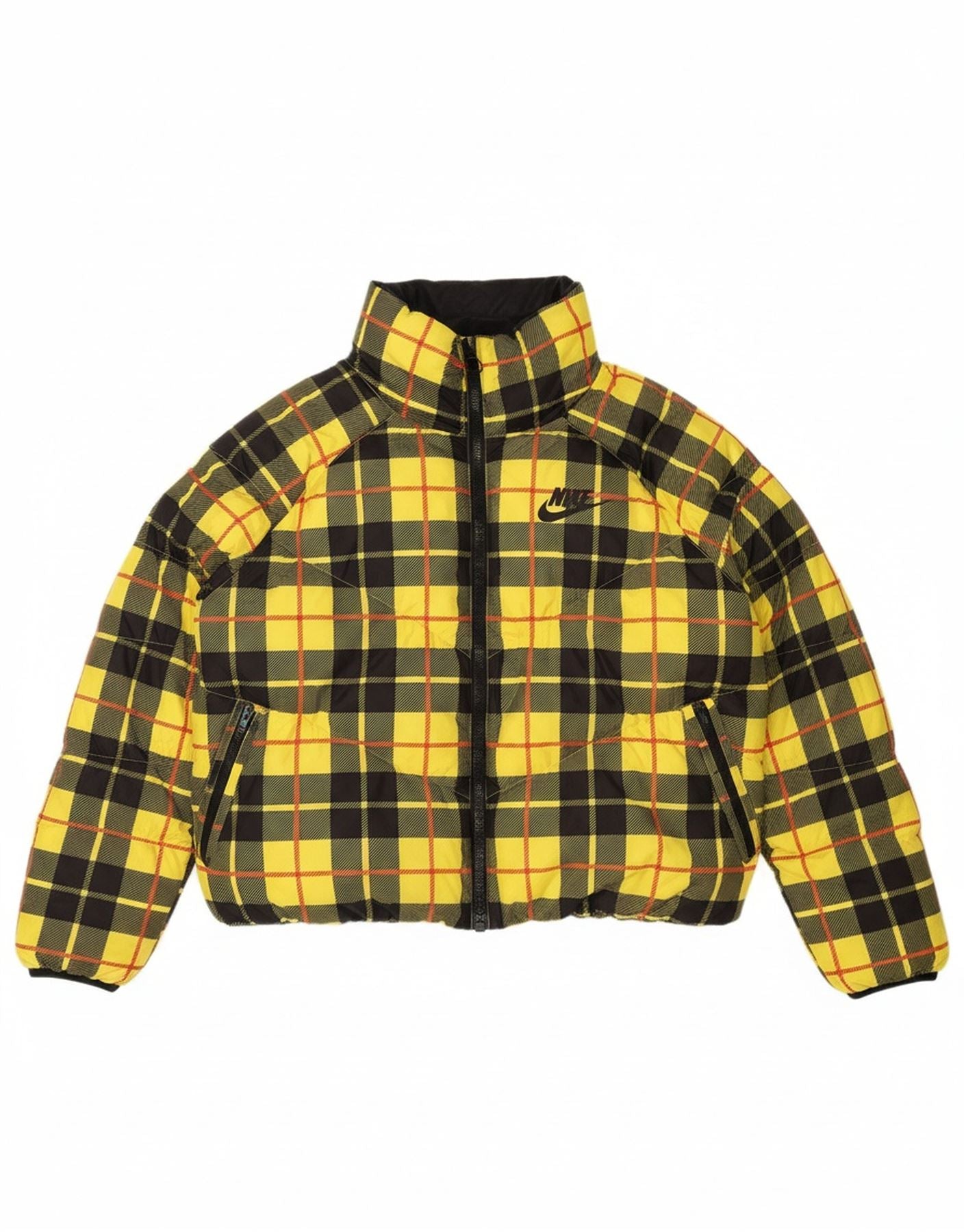 - AI Description: This Nike womens padded jacket is crafted from woven polyester, offering a padded, warm feel. It features a striking multicoloured plaid pattern, blending yellow, black, and grey tones. The high neck and long sleeves provide ample coverage. A full zip closure ensures easy wear. Practical pockets add functionality. The regular fit offers comfortable wear, complete with a subtle brand logo accent.