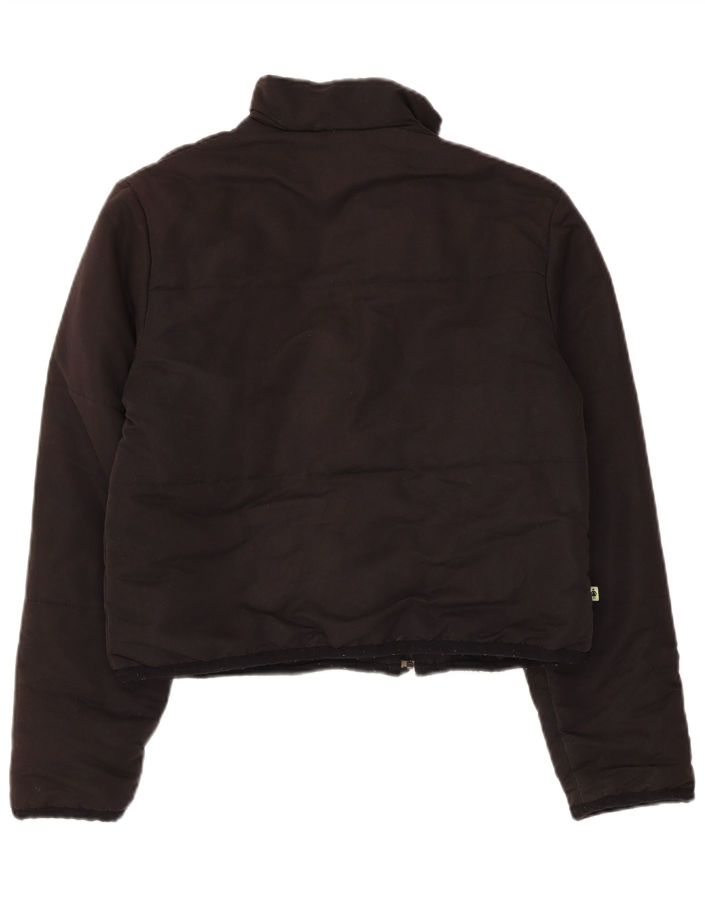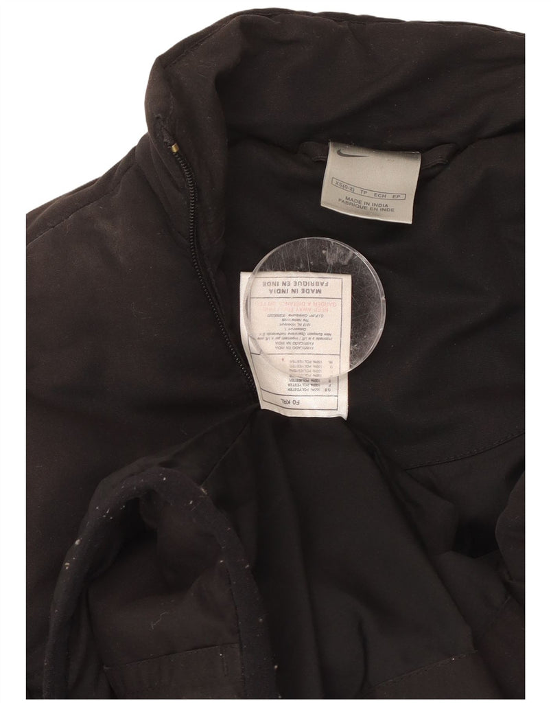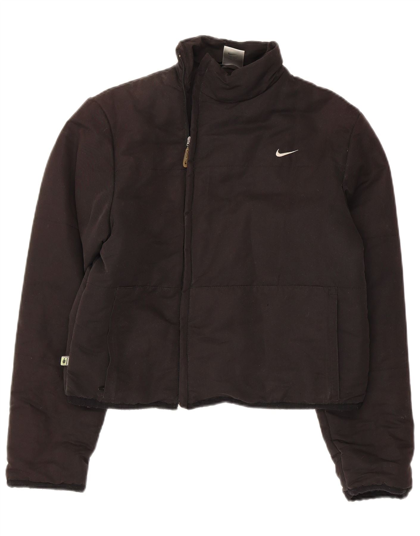 - AI Description: This Nike womens padded jacket is crafted from 100 percent polyester with a woven, padded finish. Its sleek black design features a subtle logo accent. The high neck and full zip closure offer warmth and versatility. Long sleeves and a regular fit ensure comfort. This cropped style includes practical pockets. It is ideal for sports or casual wear.