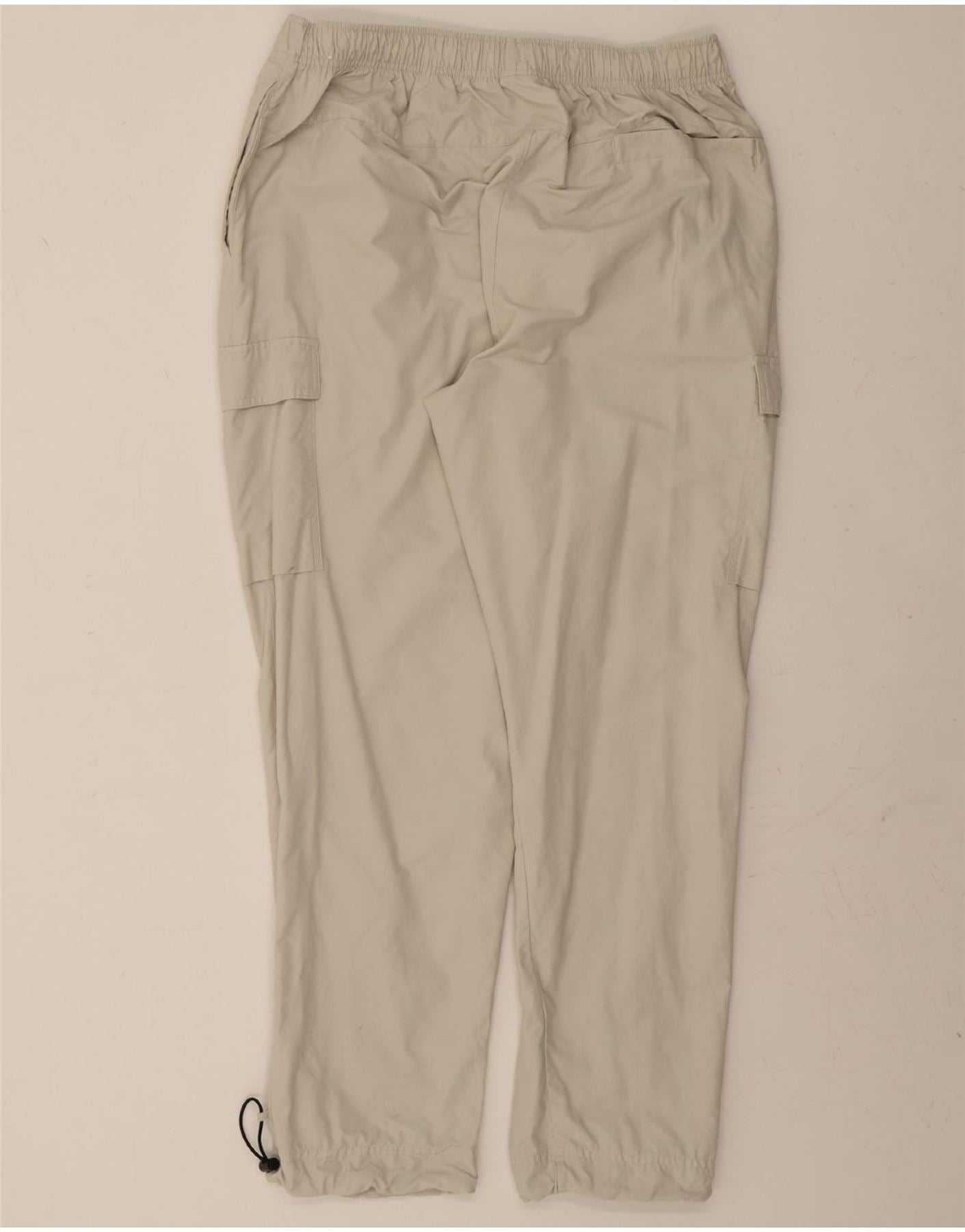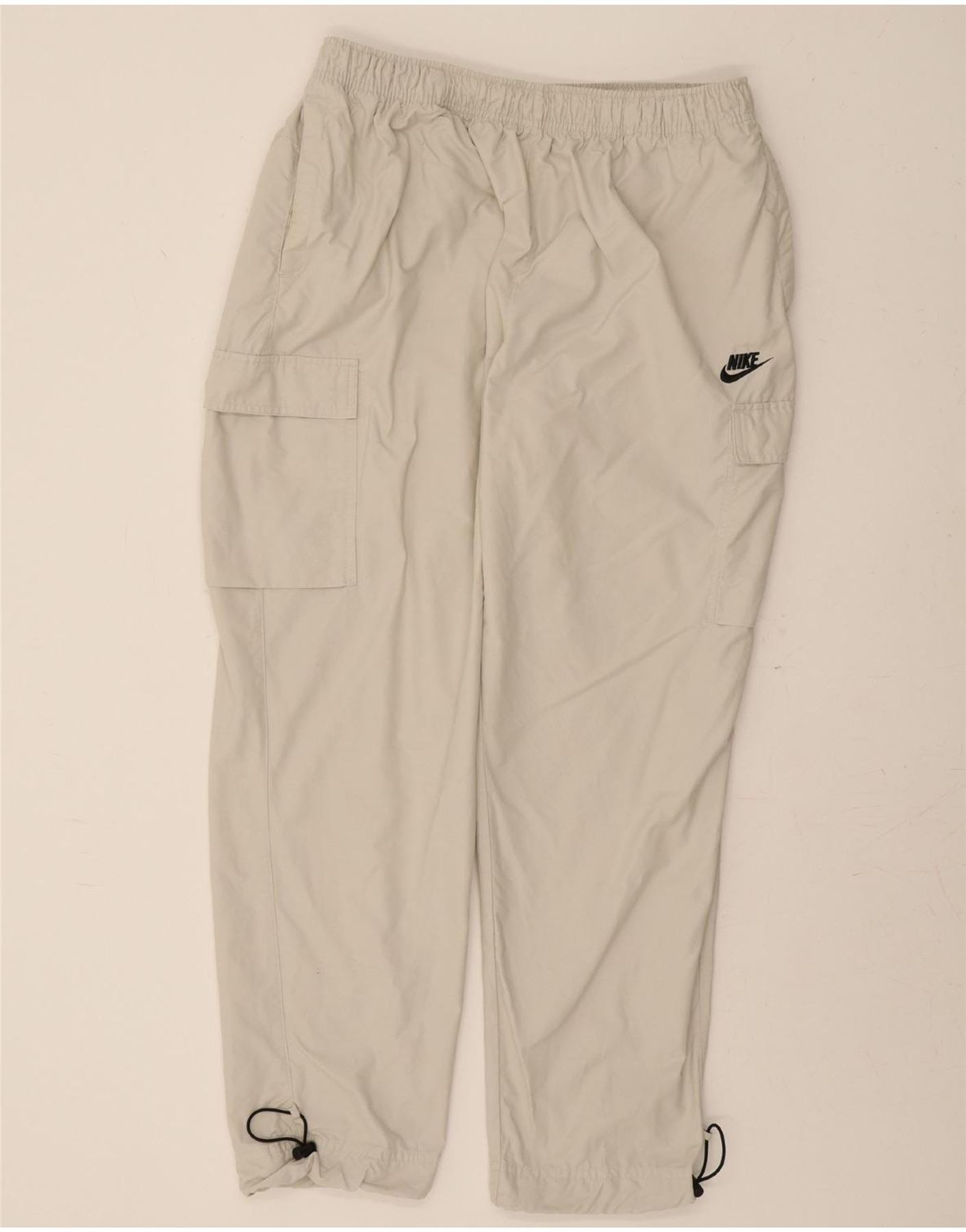 - AI Description: These pre-owned Nike cargo trousers in beige offer a relaxed fit and a sporty style. Crafted from a woven cotton and nylon blend, these size XL trousers feature a drawstring closure and adjustable elastic waist for optimal comfort. They boast practical pockets, a logo accent, and additional button, zip, and pleated detailing. Washing instructions include washing inside out with like colours and avoiding softener.