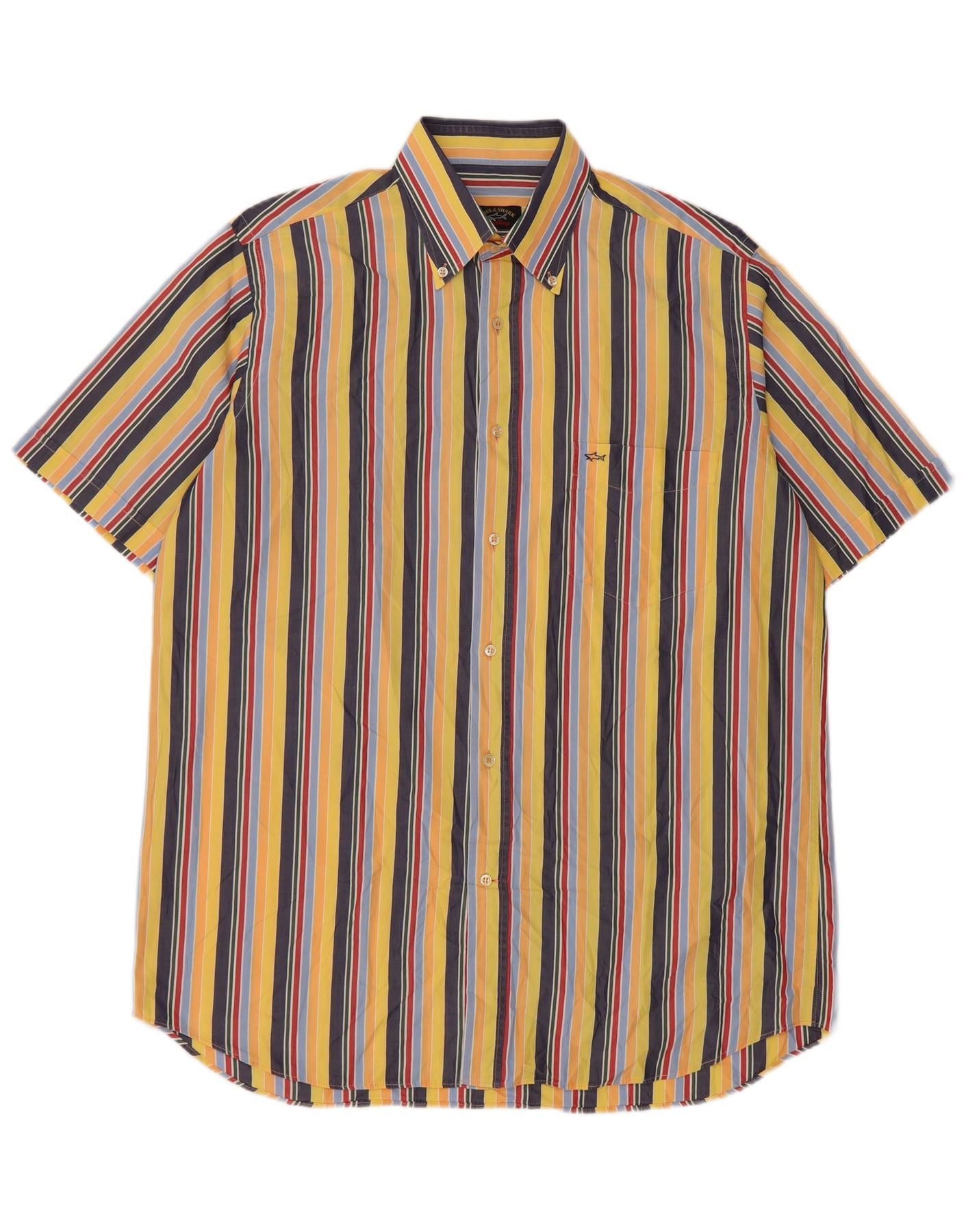 - AI Description: This Paul & Shark mens shirt is crafted from a woven fabric, offering a crisp texture. It features a vibrant multicoloured striped pattern in yellow, blue, and red tones. The collared neckline and short sleeves provide a classic silhouette. A button closure runs down the front. It has a regular fit for comfortable wear. Subtle pockets add functionality. The Paul & Shark logo provides a signature nautical accent.