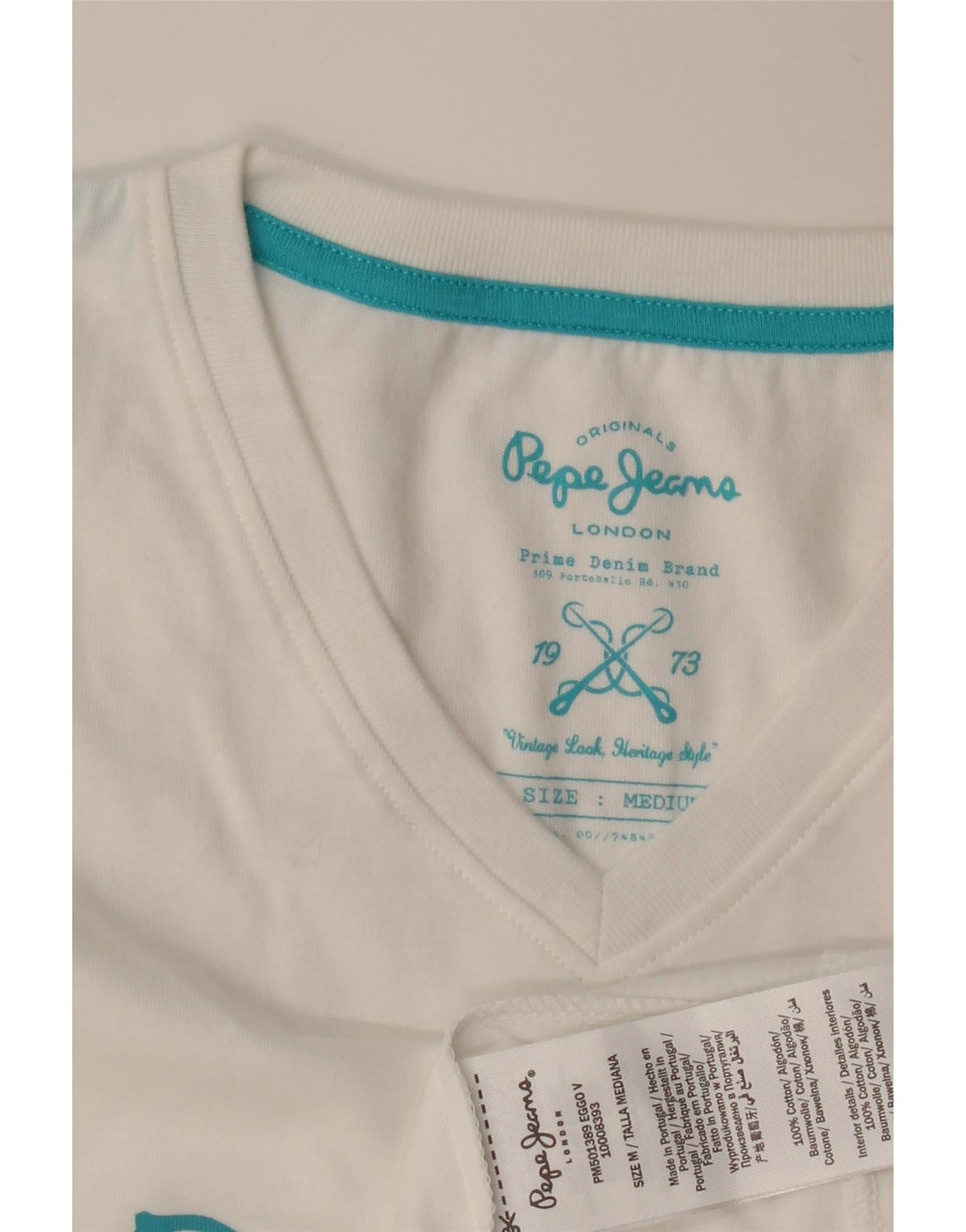 - AI Description: This Pepe Jeans womens Graphic T-Shirt Top is crafted from soft white 100 percent cotton jersey. It features a classic V-neckline and comfortable short sleeves. The regular fit offers a relaxed yet flattering silhouette. A prominent Pepe Jeans London graphic logo adorns the front, adding a signature touch. This pullover style is lightweight and provides excellent comfort for everyday wear.