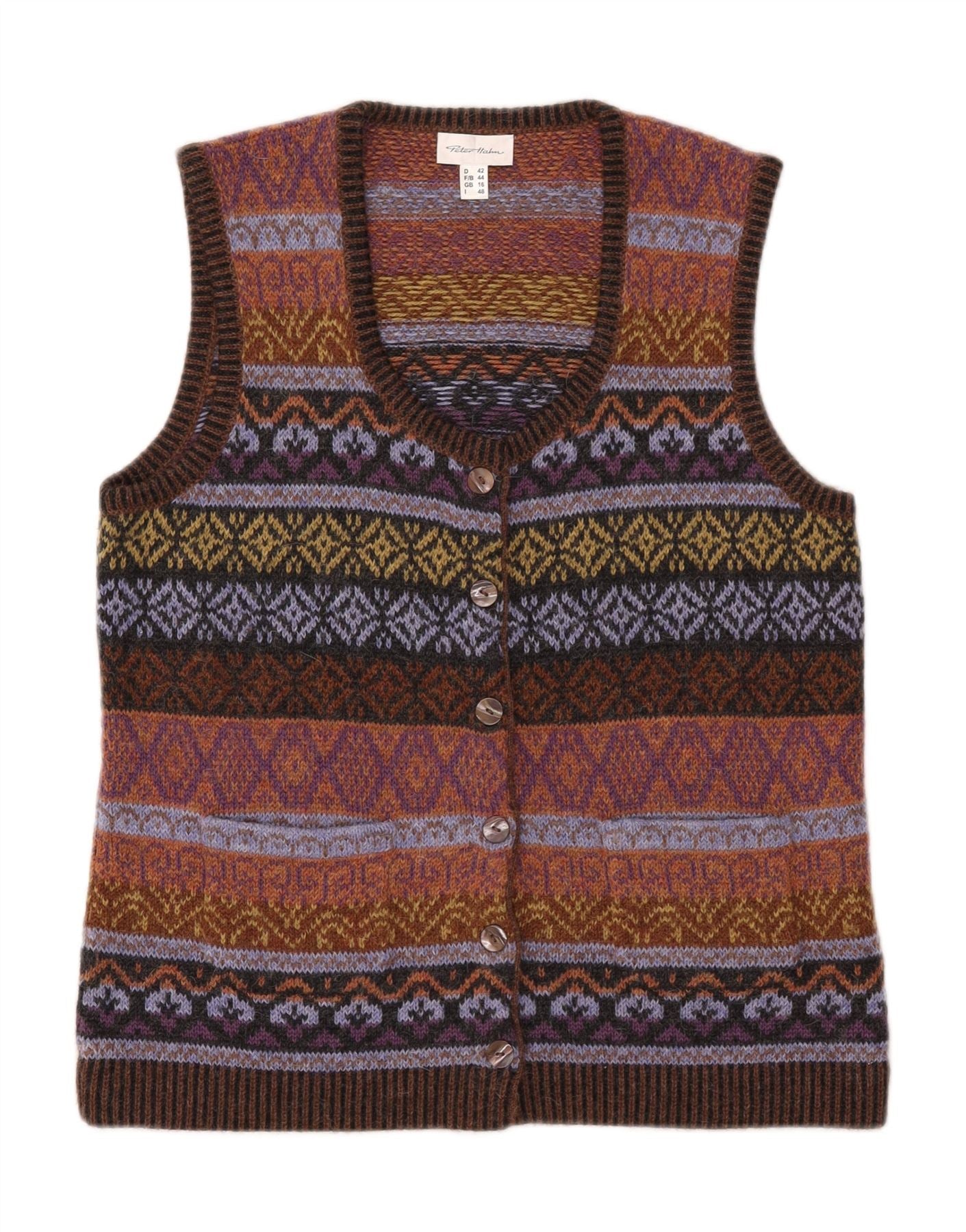 PETER HAHN Womens Sleeveless Cardigan Sweater UK 16 Large Brown Fair Isle