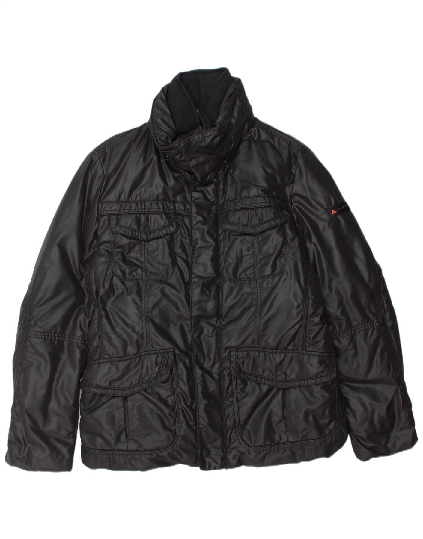 - AI Description: This Peuterey mens utility jacket is crafted from a black blended fabric, offering a padded and lined finish. It features a collared neckline and long sleeves. The regular fit ensures comfortable wear. A full zip closure secures the front. Multiple pockets add practical utility. A subtle logo provides brand accent.